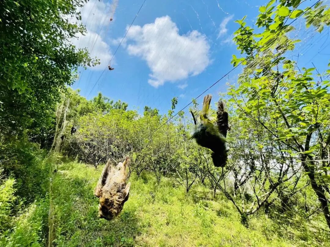 当天中午,市野生动物保护志愿者周翀和“天鹰老师”前往南云台林场小团山巡护,在一片樱桃林附近发现了两张挂满鸟尸的捕鸟网,十分震惊。