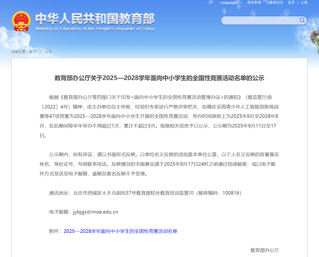 近日,教育部办公厅对《2025-2028学年面向中小学生的全国性竞赛活动名单》(俗称“白名单”)进行了公示,共包括全国青少年无人机大赛、全国青少年航天创新大赛、全国青少年模拟飞行锦标赛、“飞向北京·飞向太空”全国青少年航空航天模型教育竞赛活动、全国青少年人工智能创新挑战赛、世界机器人大会青少年机器人设计与信息素养大赛等47项竞赛活动。教育部官网公示内容显示,白名单竞赛举办时间原则上为2025年9月至2028年8月,在此期间每学年举办不得超过1次,累计不超过3次。公示期为2025年9月11日至17日。