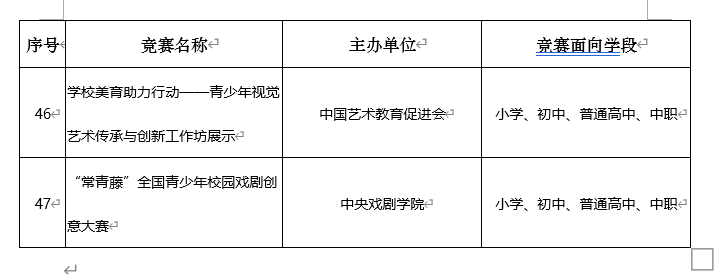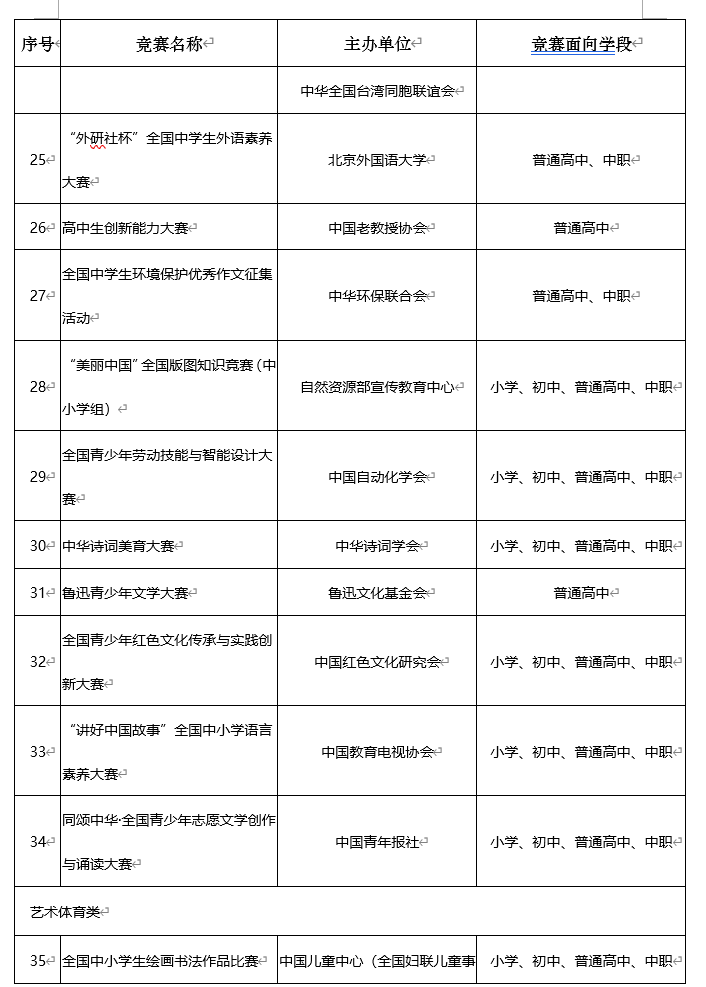 新华社介绍,本次公示的名单中,自然科学素养类竞赛活动包括全国青少年人工智能创新挑战赛、世界机器人大会青少年机器人设计与信息素养大赛、全国青少年无人机大赛、宋庆龄少年儿童发明奖等22项;人文综合素养类竞赛活动包括全国青少年禁毒知识竞赛、世界华人学生作文大赛、“外研社杯”全国中学生外语素养大赛、高中生创新能力大赛等12项;艺术体育类包括全国中小学生绘画书法作品比赛、“我爱祖国海疆”全国青少年航海模型教育竞赛、“驾驭未来”全国青少年车辆模型教育竞赛、“飞向北京·飞向太空”全国青少年航空航天模型教育竞赛活动等13项。