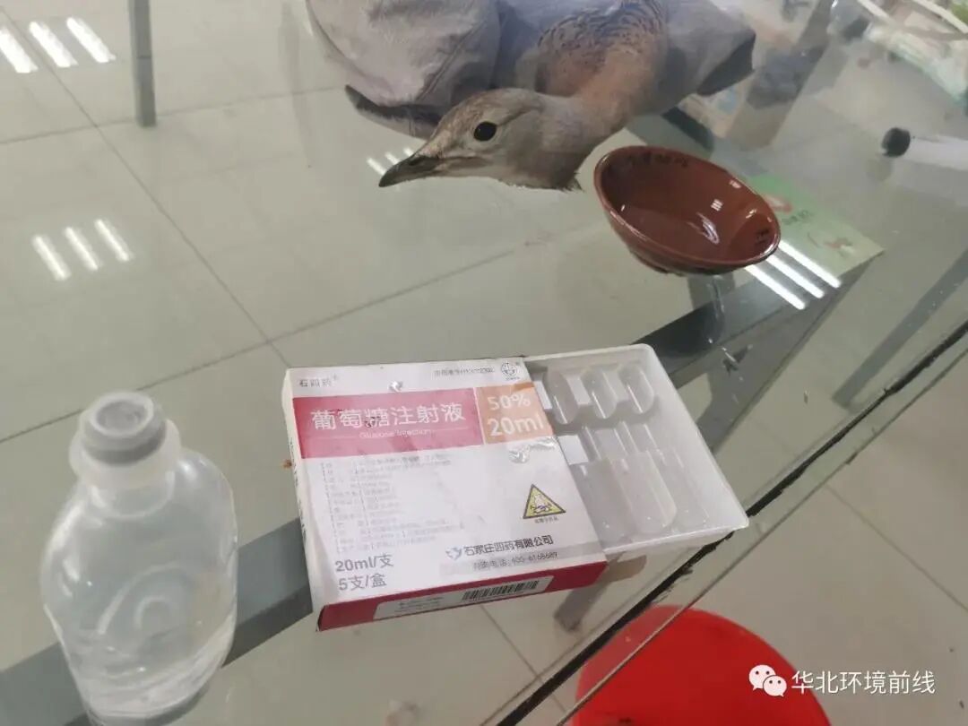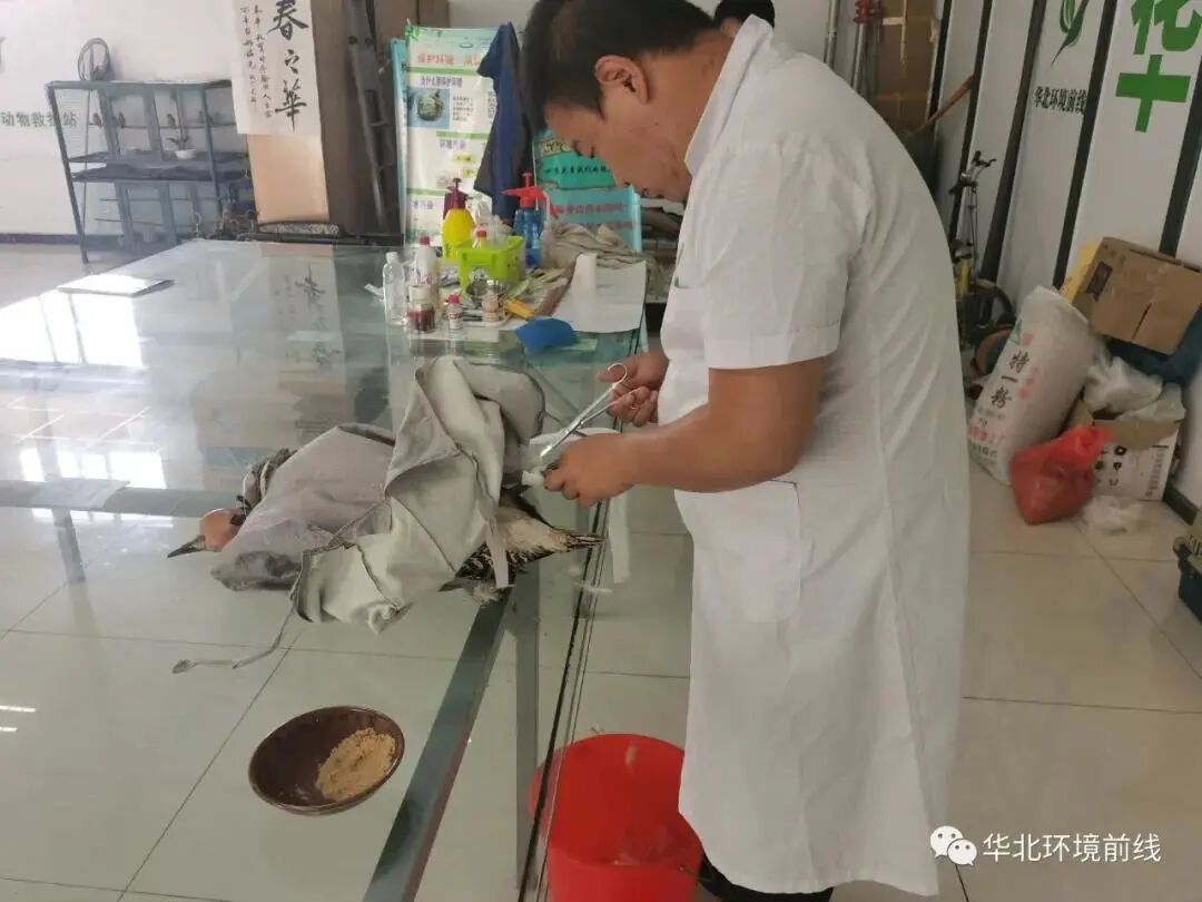 将大鸨简单包扎后马上将其送往石家庄救护站,在救护站内兽医郑利强开始对大鸨进行清创手术,去除大腿和腐烂污物。下午四点,清创手术才完成,用盐水冲洗干净后,附上了云南白药。同时给大鸨补充葡萄糖、维C,人工喂食添加药品妈咪爱和消炎药。