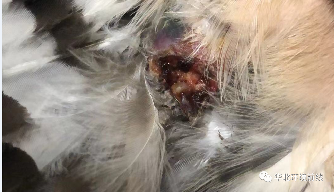 送往救助站发现大鸨无法站立,左侧大腿根部腐烂,腐烂的地方呈洞状深入腹腔,状态非常差。