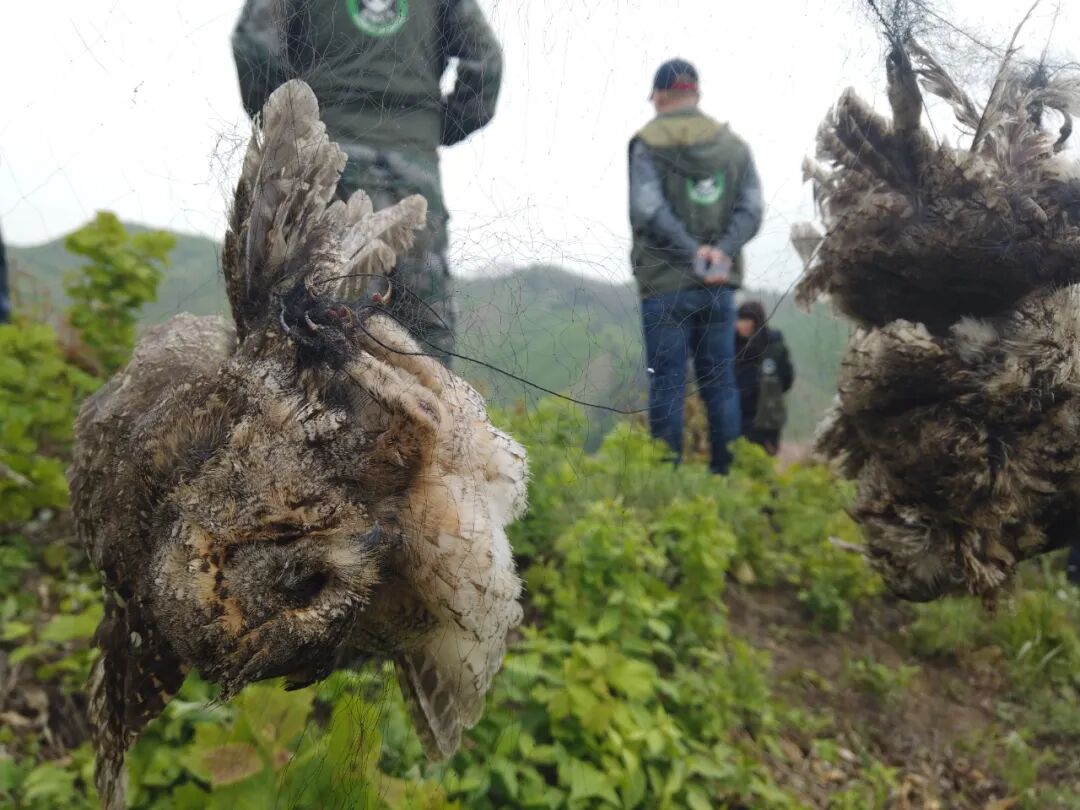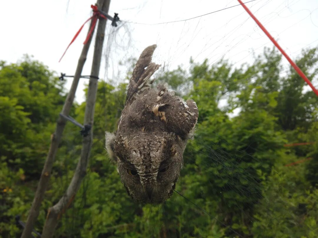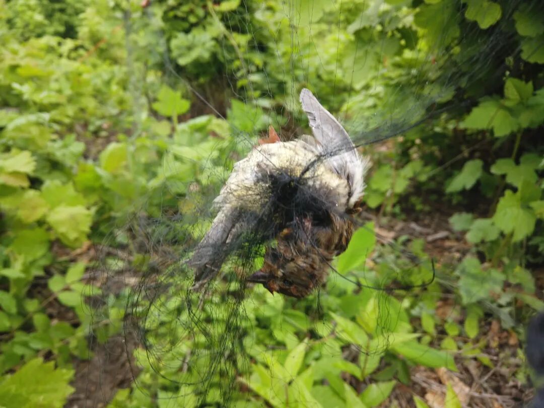 5月12日,让候鸟飞伙伴东北野战军护鸟团队联合辽阳护飞队巡护辽宁抚顺石文镇,在相隔不远两个山头发现两个捕猎场,一共有将近20张鸟网,大大小小约30只鸟儿死在了网上,有的尸体已经高度腐烂。在鸟网上,志愿者共发现4只国家二级保护动物红角鸮,其中两只还活着,爪子被鸟网缠了一圈又一圈,取网都十分困难。