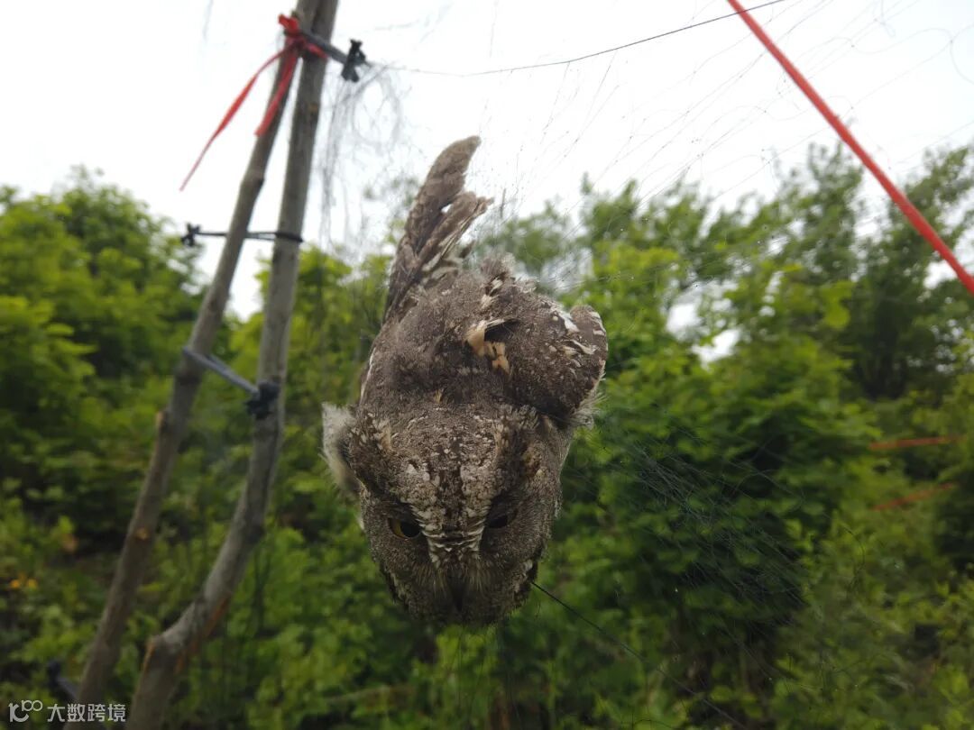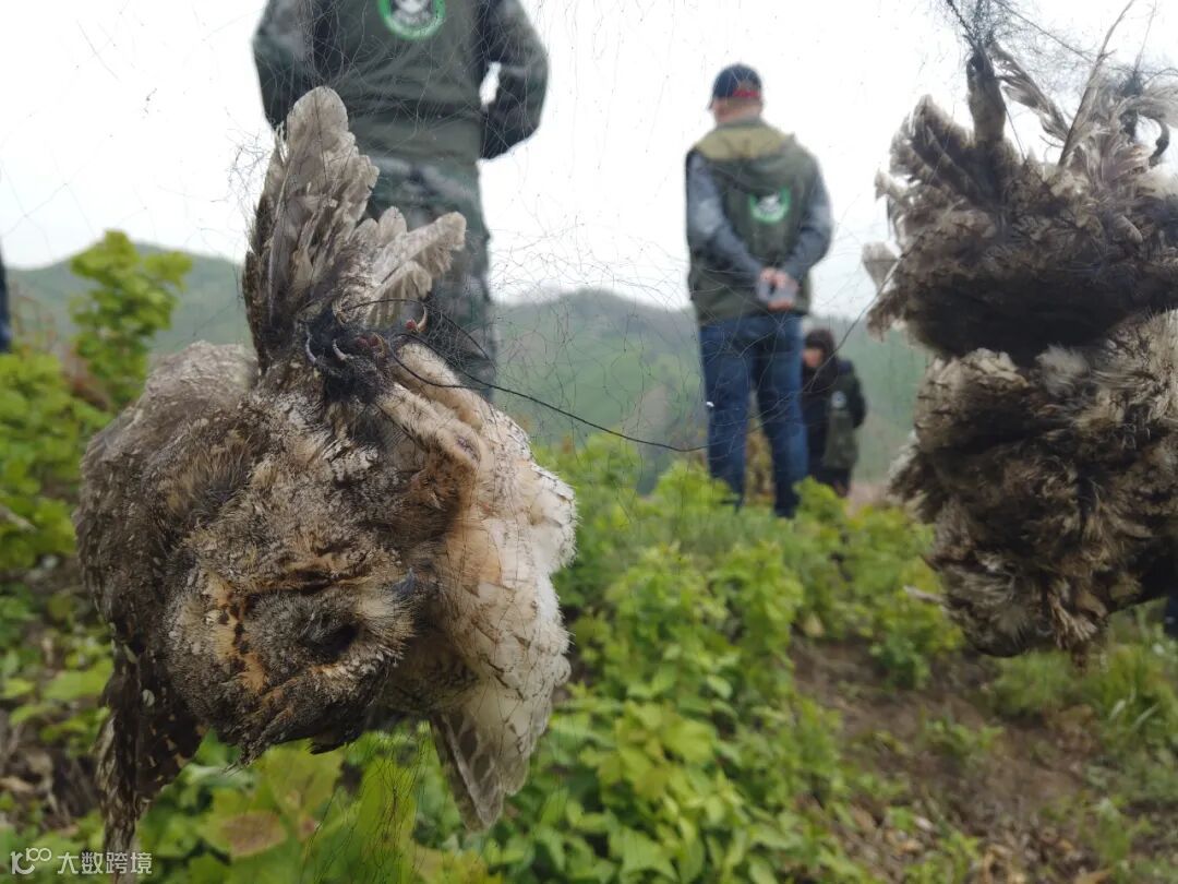 第一个捕猎场在山上布网整整一圈,三只红角鸮都在一张网上,两死一伤。早上七点左右,志愿者发现后立即举报,抚顺执法人员对此案十分重视,森林公安、自然资源局、镇政府一起赶来现场。
