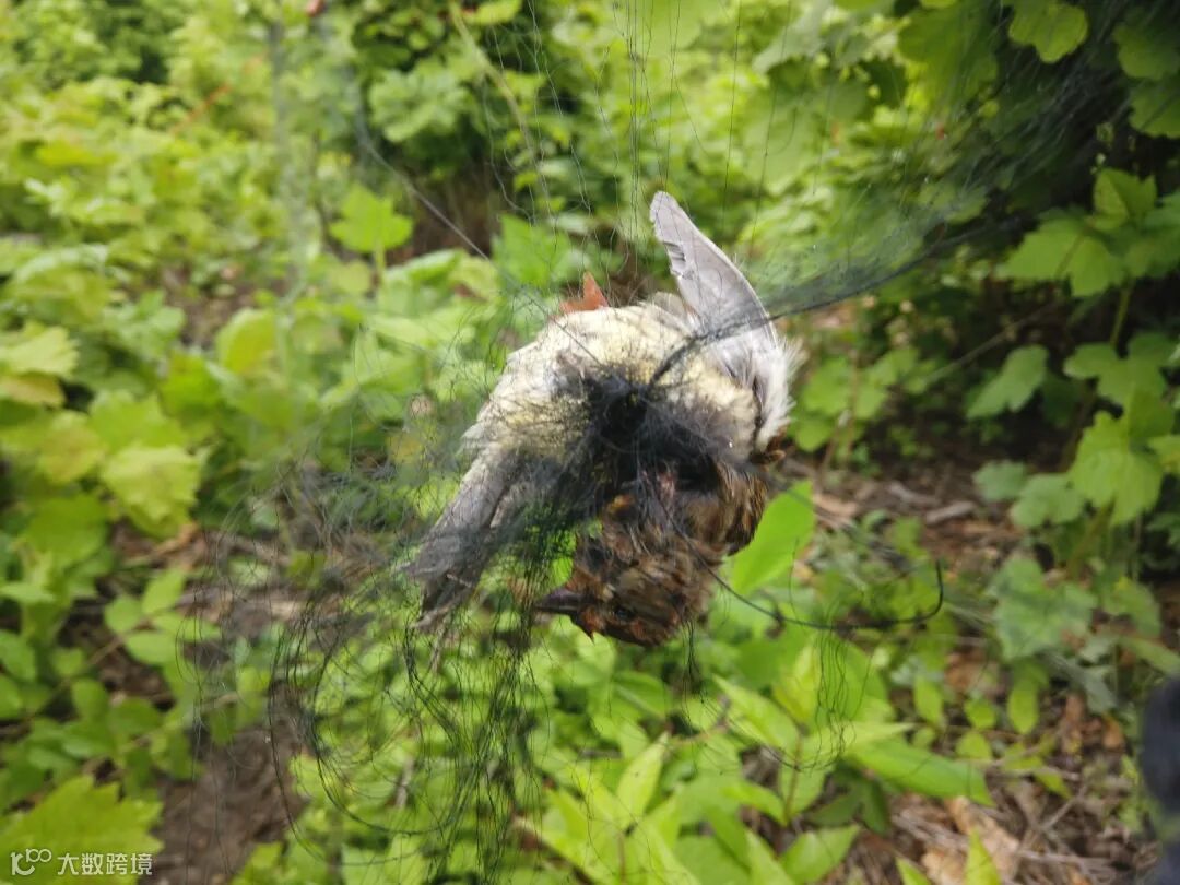 在等待过程中,志愿者翻上另一座山头,又发现了一个有四张网的捕猎场。两个捕猎场都是蚕农下网,但驱鸟其实有许多方法,不远山上有蚕农选择用声音驱赶,驱鸟带、防鸟网也是相当有效的方法,布网人却偏偏选择用捕鸟网残杀鸟儿。