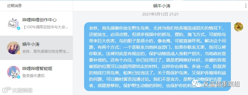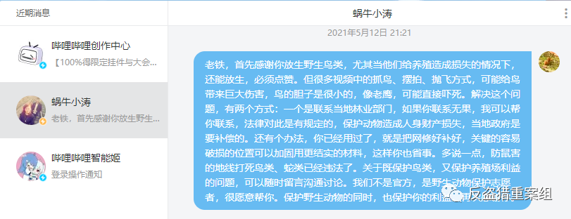 作为野生动物保护志愿者,我们既要保护人,也要保护鸟。于是,就以上问题通过私信和公开评论等方式尝试联系该up主,但均未得到回复。