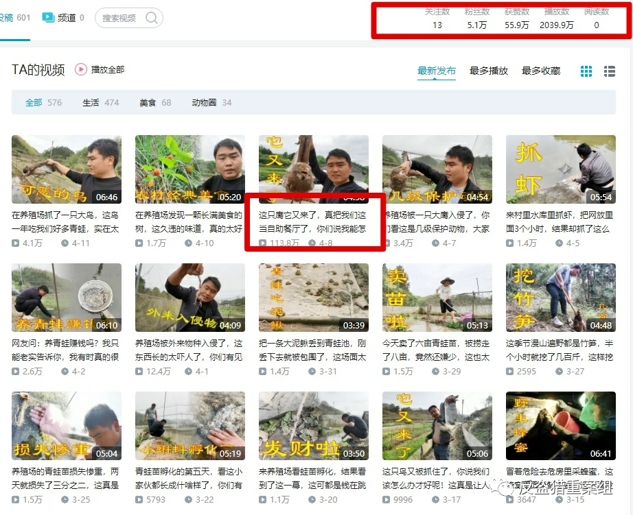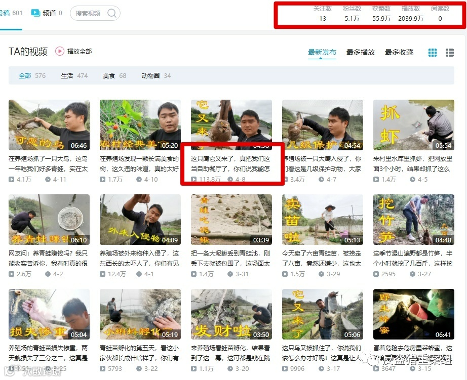 尽管他一直强调鸟类给养殖场造成了很大损失(有损失是事实),显得很无奈,但从大量视频内容以及留言评论中却看不出他有多想解决问题,似乎有点“乐此不疲”。追逐、捕捉、放生鸟类的视频,播放量一般都更高,有些视频播放量甚至达到100多万。伴随着视频的热播,该UP主的粉丝数也突破了5万。