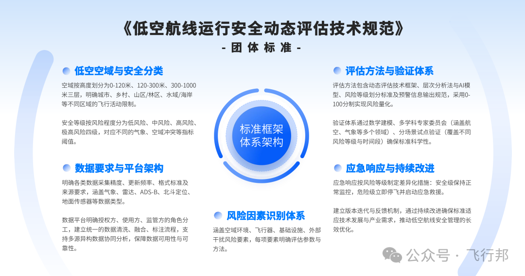 《低空航线运行安全动态评估技术规范》作为国内首个聚焦低空航线安全的团体标准,用来动态预警低空飞行中可能遇到的突发天气、飞行冲突、设备故障等风险,帮助更安全、更高效地开展低空物流、巡检、应急救援等业务。