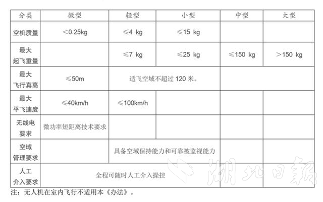 本办法所称民用无人驾驶航空器是指没有机载驾驶员、自备动力系统的航空器,按照重量和性能指标分为微型、轻型、小型、中型和大型。