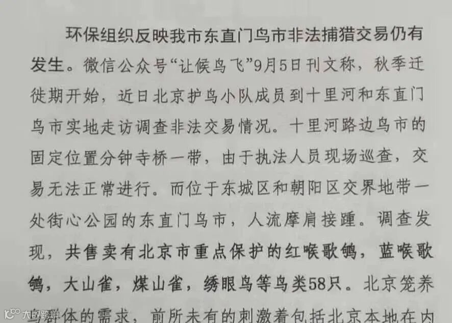 北京护鸟小队就东直门鸟市非法交易猖獗的情况进行了平台直播后,市政府有关负责人对该问题进行了督导,督导后该鸟市非法交易得到有效季节性控制。