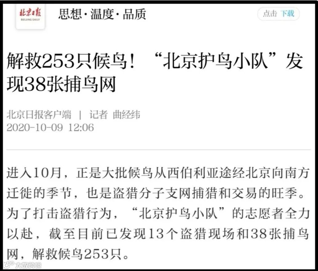 北京护鸟小队的“秋季护鸟保卫战”得到了媒体伙伴的关注并采写报道。新闻发布之后得到市政府关注,邀请北京市园林绿化局野生动物植物保护处,执法监察大队和我团队负责人进行座谈和督导。会议后,北京护鸟小队向市局负责办公室提交了“北京盗猎地图”和“北京鸟市地图”详细资料,为秋季迁徙期全市范围的严打提供了有效的帮助。