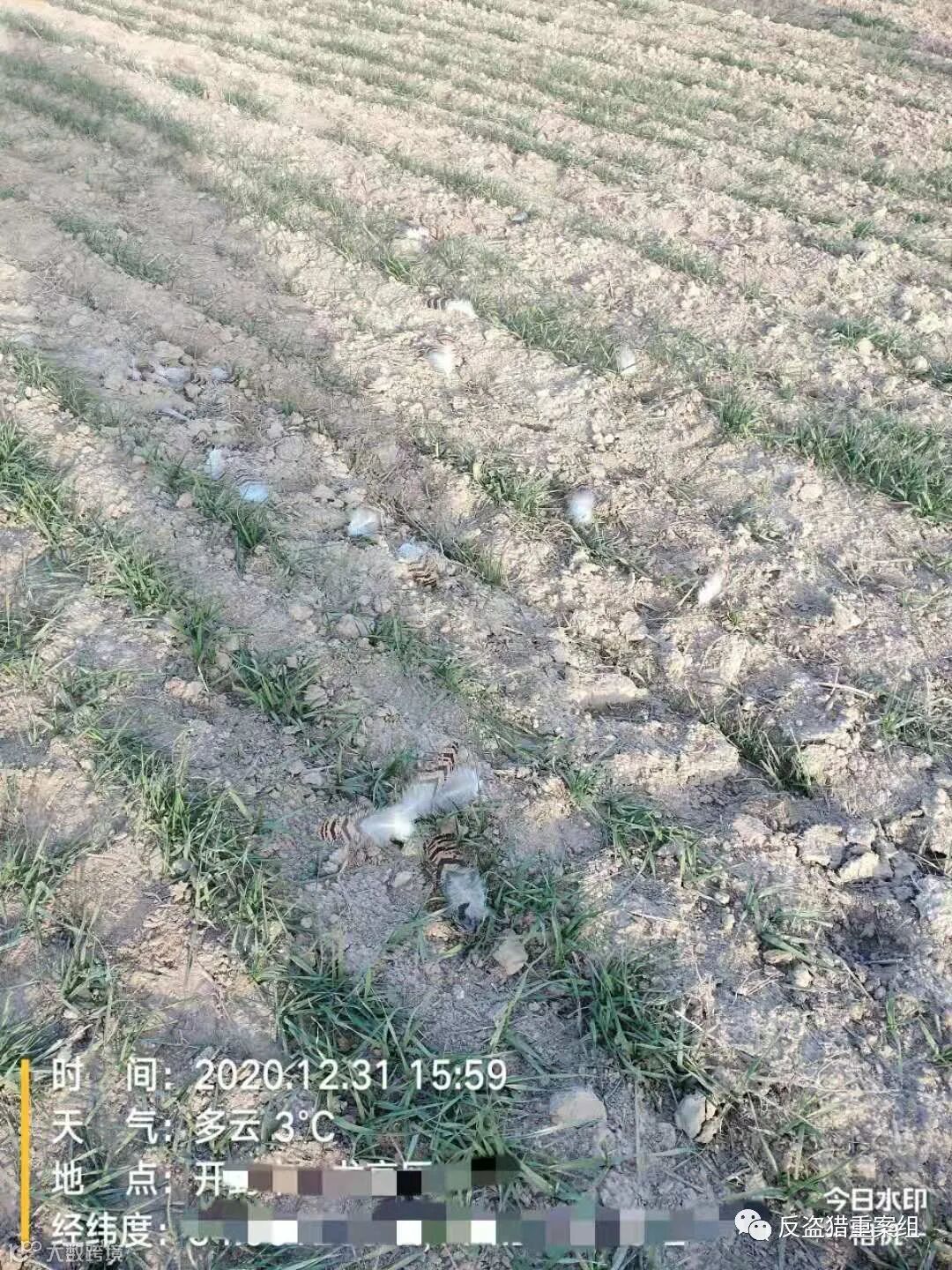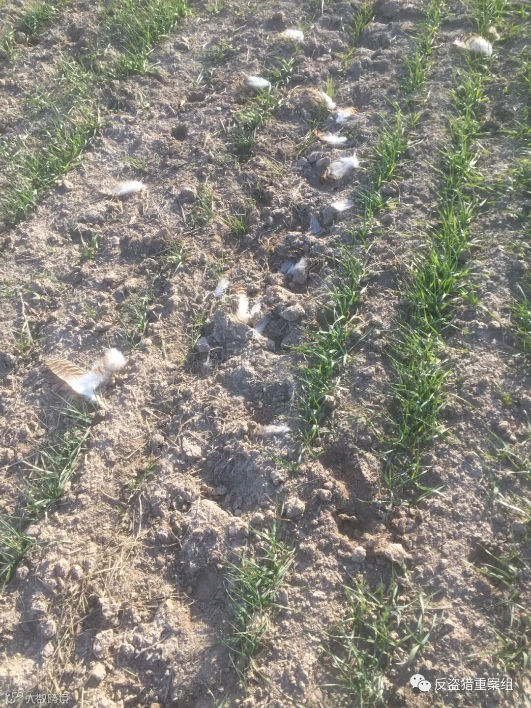疑似毒饵附近的麦苗全部死亡,周边发现有死亡云雀和斑鸠,另有让人揪心的大量鸟毛,包括不少国家一级保护动物大鸨的羽毛。志愿者很担心,除了已经死亡的三有保护鸟类之外,可能还有大鸨遭遇不测。