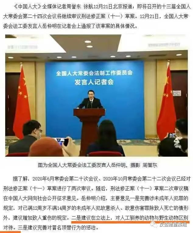 2020年12月21日,全国人大法工委发言人在记者会上谈到刑法修正案(十一)草案修订情况时提到,主要意见之一就是建议在立法上,对人工驯养的动物与野生动物区别对待。