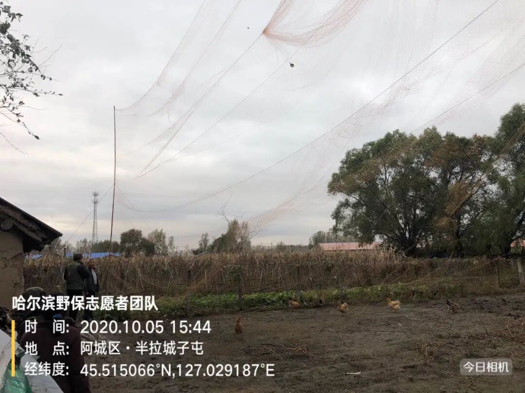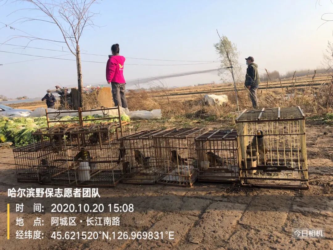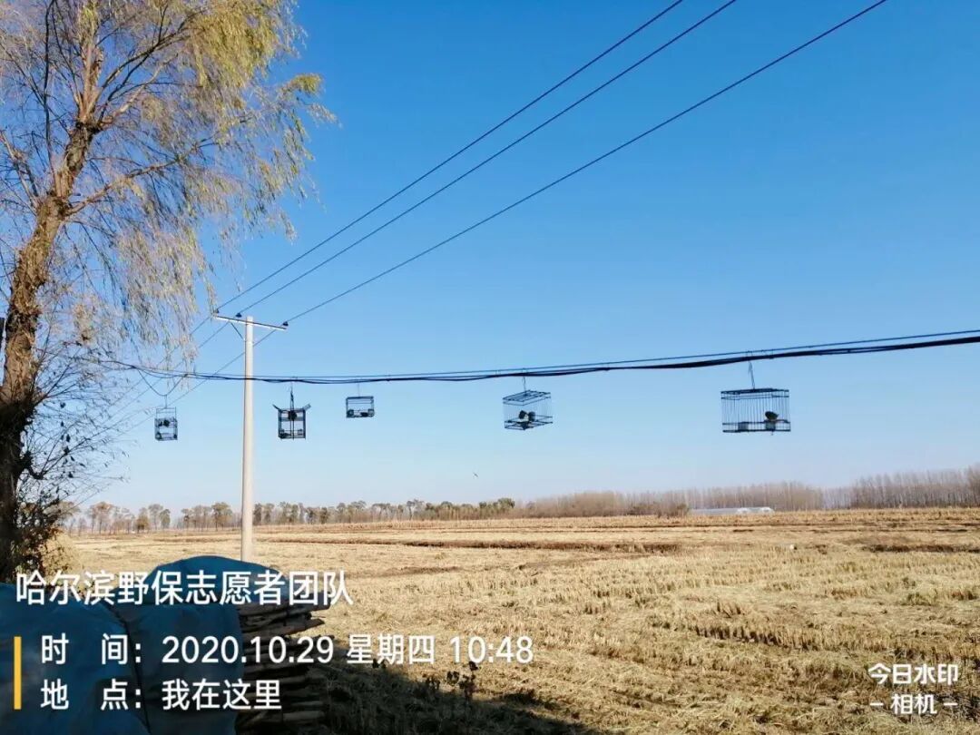 20 名志愿者针对哈市候鸟迁徙重点区域城乡结合部 、村屯开展巡护行动及普法宣传。行程 160 多公里,巡护香坊区丁香科技博览园、西柞村、孙家屯、幸福镇等地村屯,现场解救并成功放飞黄雀、燕雀、斑鸫、山雀、白腰朱顶雀、蜡嘴雀、普通朱雀、红胁蓝尾鸲等各类野生鸟共 108 只,其中包括一只国家二级重点保护动物猫头鹰成体。同时,清理并销毁了拍笼、滚笼、诱(养)笼 32 个,发现并处理捕鸟粘网 13 片、 网杆 13 根,其中拆除林地鸟网 7 片,农户自行销毁家中未用鸟网 4 片以及捕鸟现场发现的鸟网 2 片。