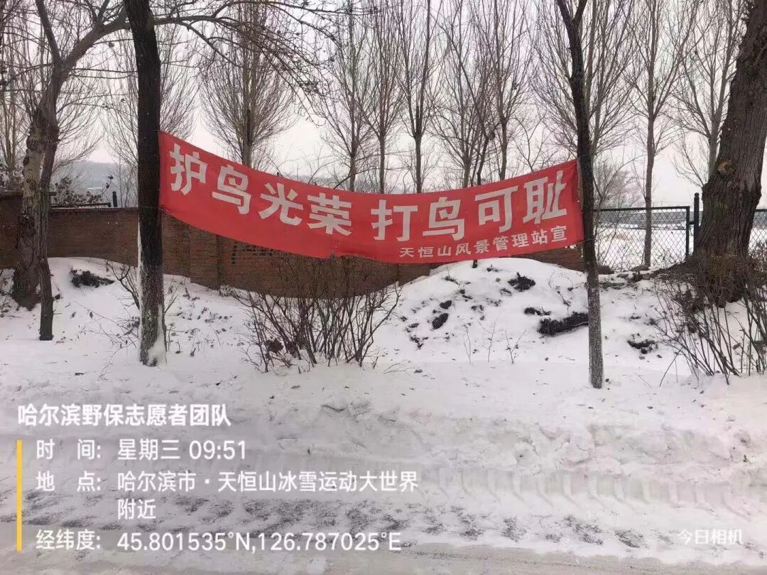 15名志愿者顶风冒雪继续针对哈市候鸟迁徙重点区域城乡结合部、村屯开展巡护宣传行动,100多公里,巡护了道外区峰火屯、东风镇、天恒山风景区、天恒山冰雪运动大世界、新立村、石人沟村,放飞苏雀5只,销毁拍笼1个,宣传10余人次。