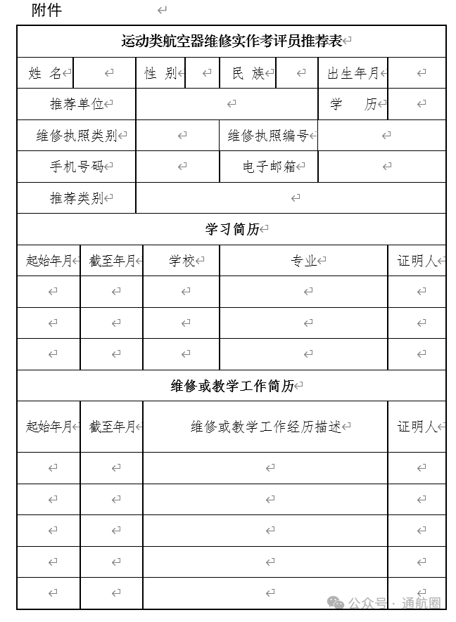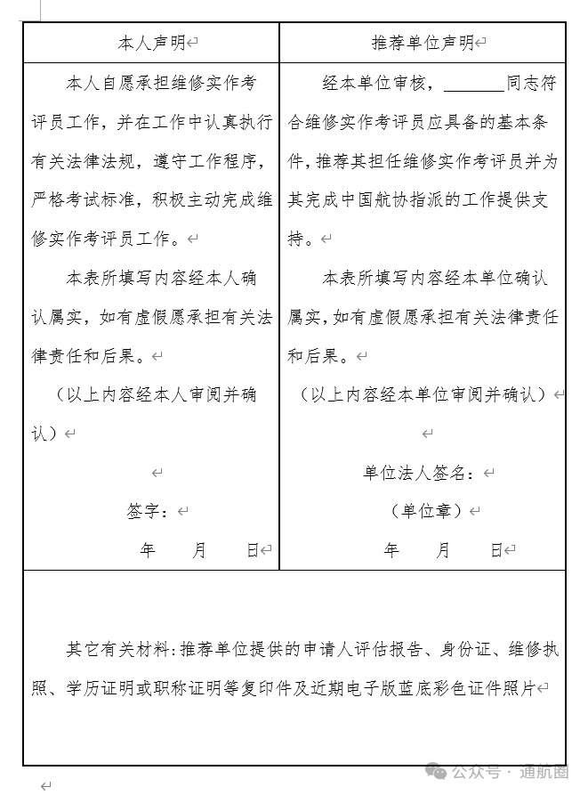 推荐前,考评员推荐单位应当对维修实作考评员申请人的维修知识、维修技术、考试大纲掌握、判断能力、工作态度等方面综合能力进行评估,并提供评估报告,填写《运动类航空器维修实作考评员推荐表》(见附件),并将相关材料提交给中国航协。