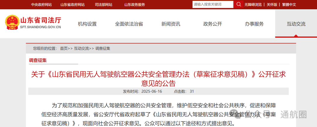 目前,该《办法》正在面向社会公众征求反馈意见,公众可发送电子邮件至jjzd_shangjin@shandong.cn(邮件主题注明“《山东省民用无人驾驶航空器公共安全管理办法》征求意见”);邮寄信函至济南市市中区经二路185号山东省公安厅(邮编250001,信封右上角注明相关字样);或登录山东省司法厅官网“首页-互动交流-法规规章草案意见征集”在线提出意见等。