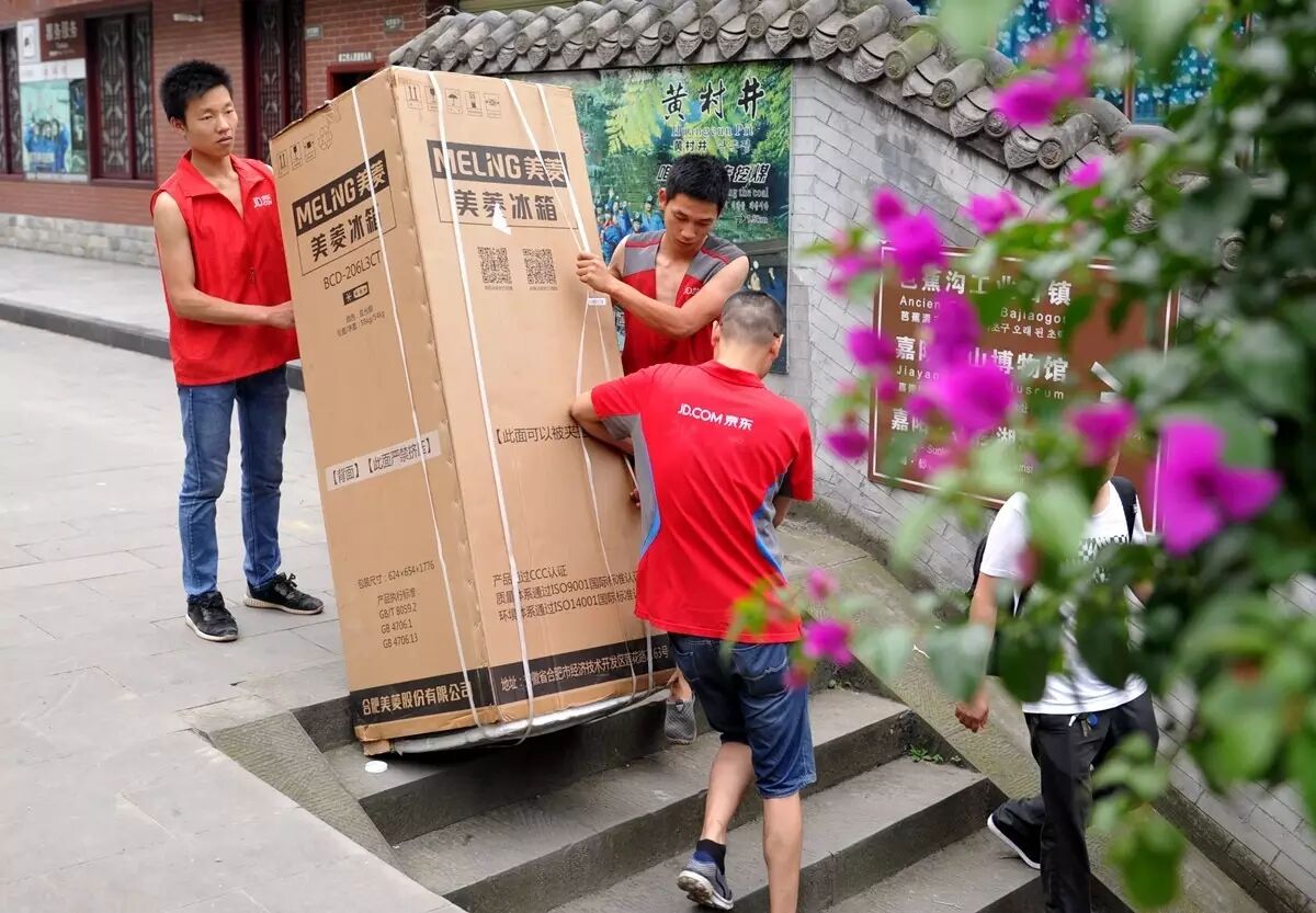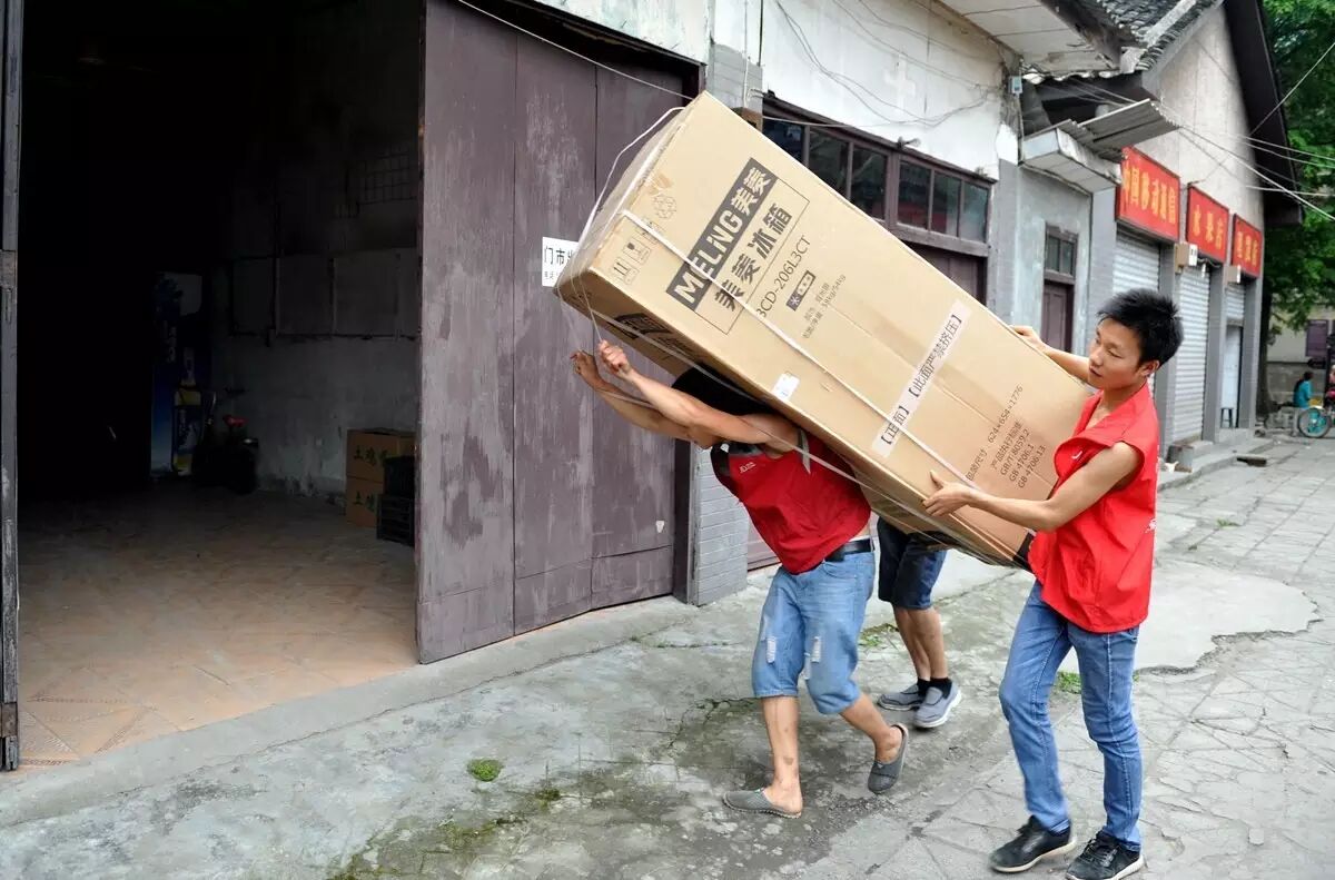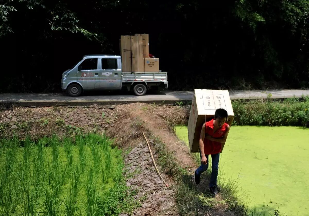 第一个客户家住村里,最后一小段路车进不去,快递小哥果断把冰箱背到肩上,沿着村民们踩出的小路寻找农家。都是些重家伙,小哥很快就大汗淋漓。
