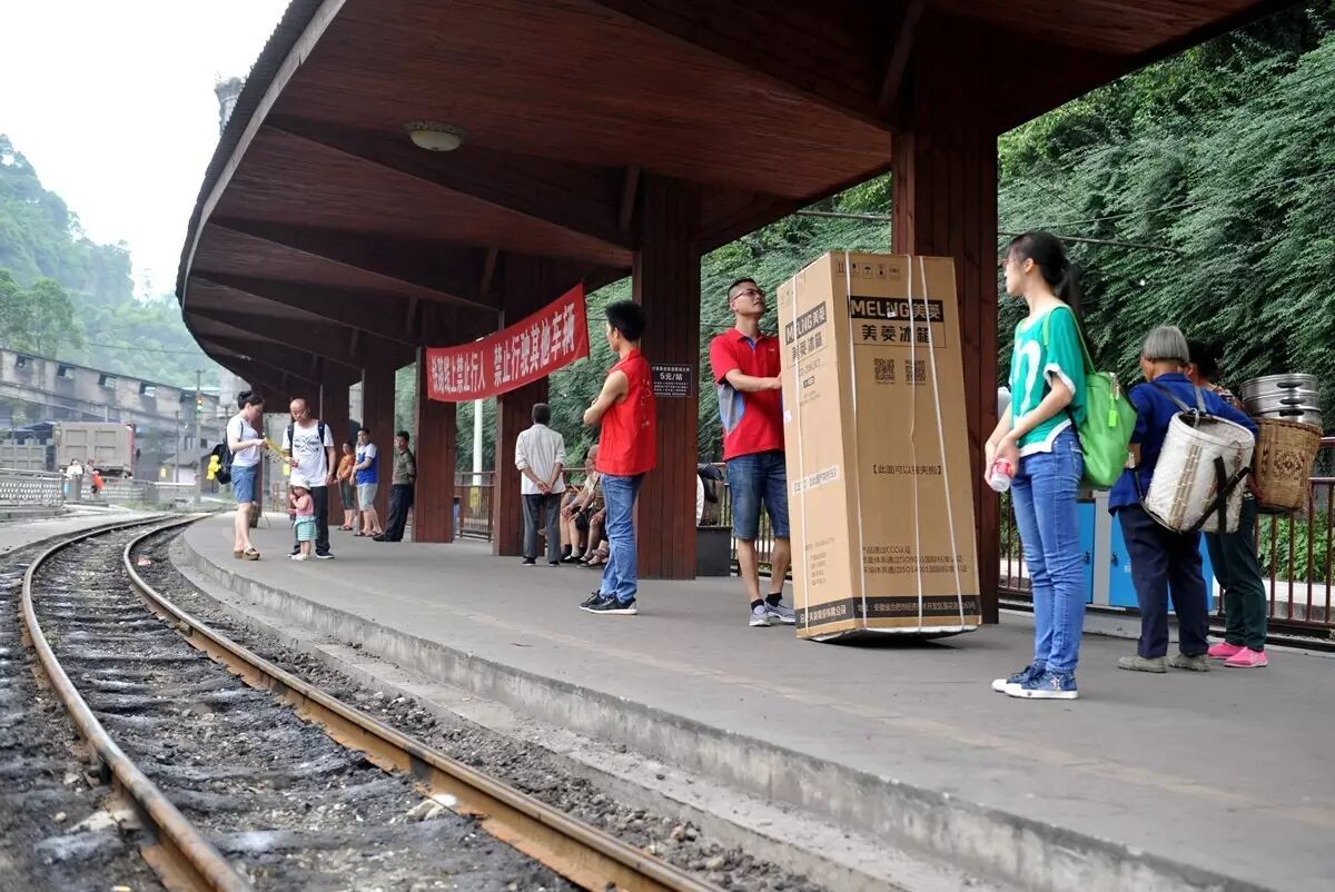 第二个客户叫余剑华,家住芭蕉沟,就是吸引了全国各地游客前来看油菜花、坐小火车的“嘉阳小火车”所在的乡镇。为了保持原貌和吸引力,所以这里的火车还是蒸汽机车。到了近火车站的地方,快递小哥们被告知面包车开不进去,他们只能和当地居民一样,坐载客小火车进入黄村井村。买票,在站台上等待火车到来。