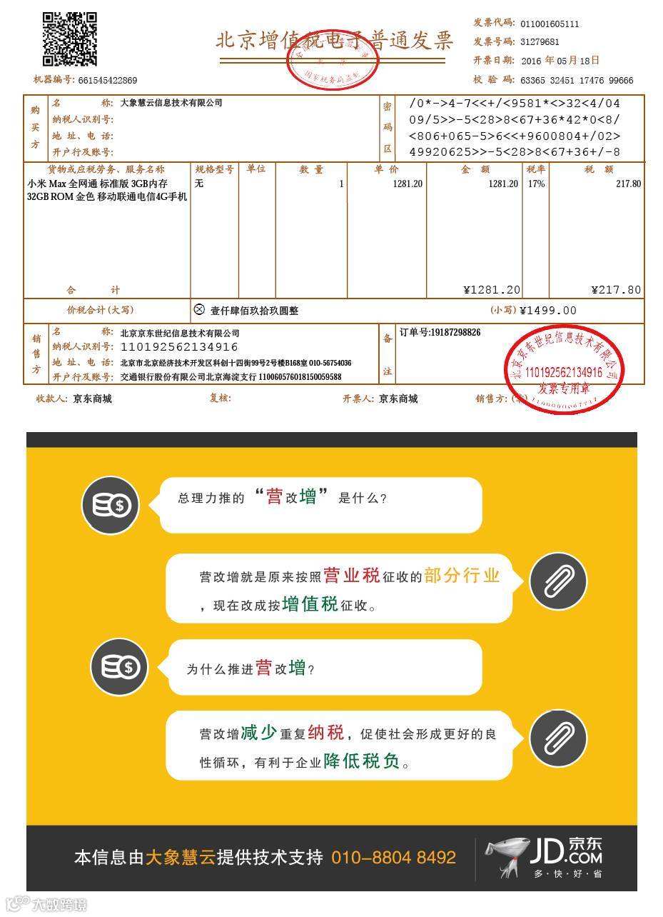 2016年5月18日,京东集团响应国家号召,积极推进“营改增”政策的落地实施,将政府关于“营改增”政策的明文规定加入京东的电子发票中。这是京东集团在《“互联网+税务”行动计划》的倡导下,在电子发票的创新基础上的又一次突破。今后,京东在北京及全国范围内将会陆续采用新的电子发票,其所涉及的发票数量每日将达到数百万份。这对提升京东的开票效率和普及国民的税法知识将起到非常积极的推动作用。