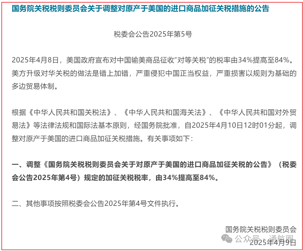 就在今天,国务院关税税则委员会发布公告,自4月10日12时01分起,调整对美关税税率,从34%提高至84%。