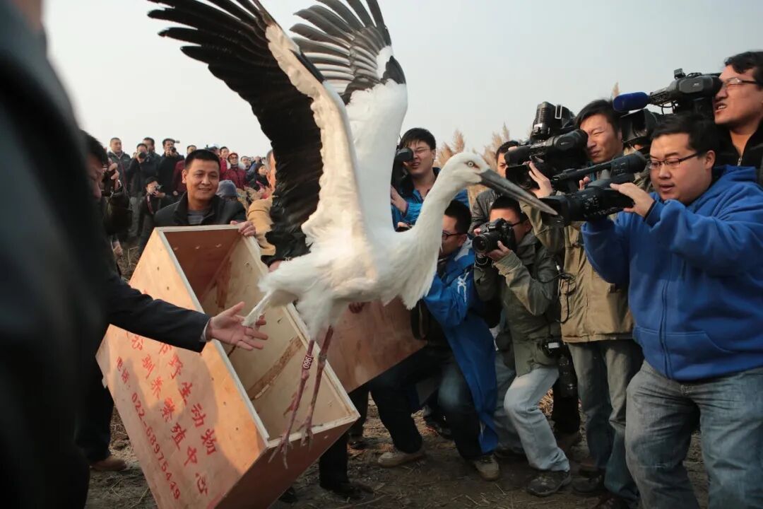 印象最深刻的,是2012年11月11日,东方白鹳在北大港湿地遭遇盗猎分子投毒,大家伙儿紧急救援,有北京的兽医及时赶到,有天津的救援队连夜到达,十天后,13只东方白鹳顺利救治放飞。