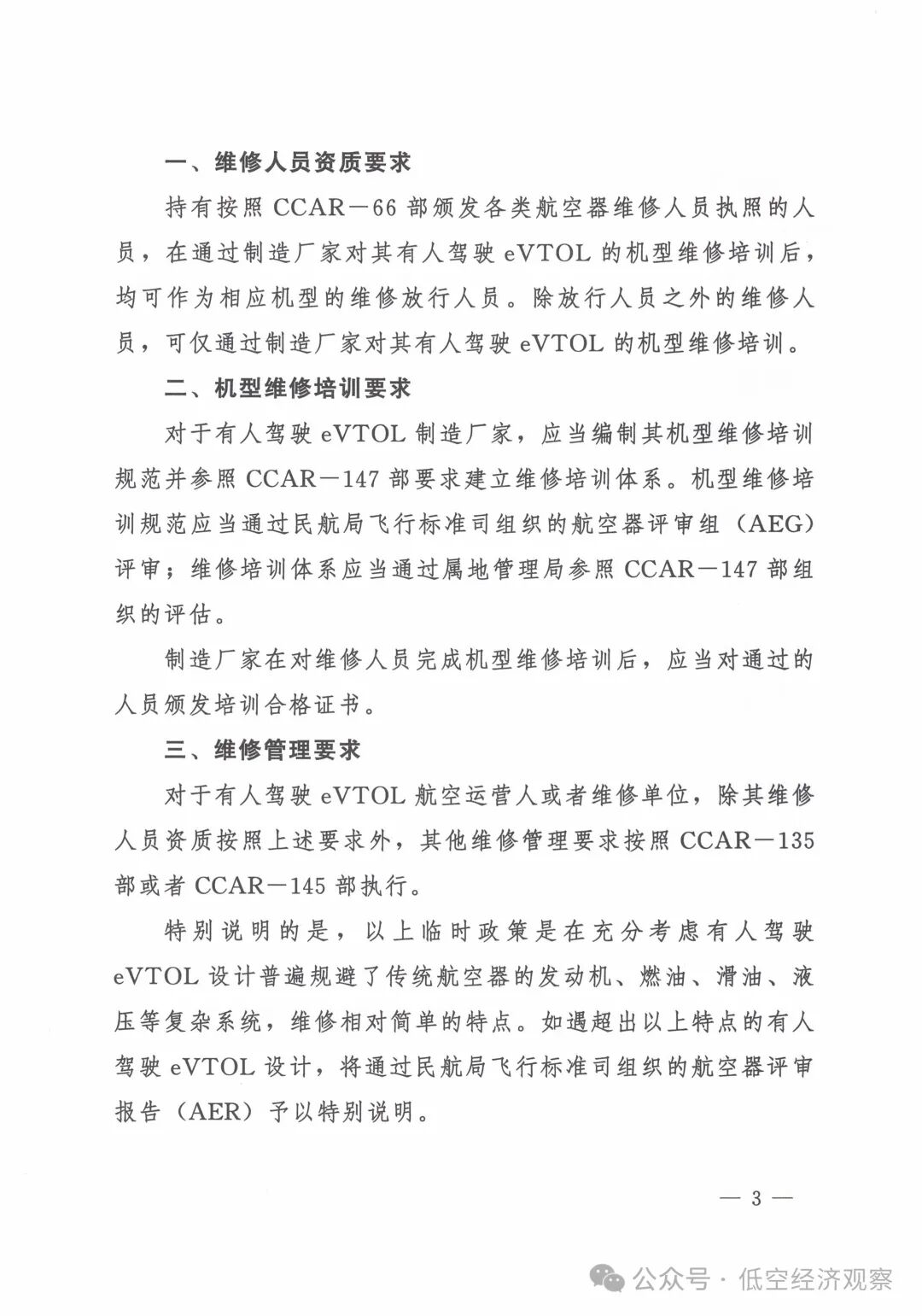 特别说明的是,以上临时政策是在充分考虑有人驾驶eVTOL设计普遍规避了传统航空器的发动机、燃油、滑油、液压等复杂系统,维修相对简单的特点。如遇超出以上特点的有人驾驶eVTOL设计,将通过民航局飞行标准司组织的航空器评审报告(AER)予以特别说明。