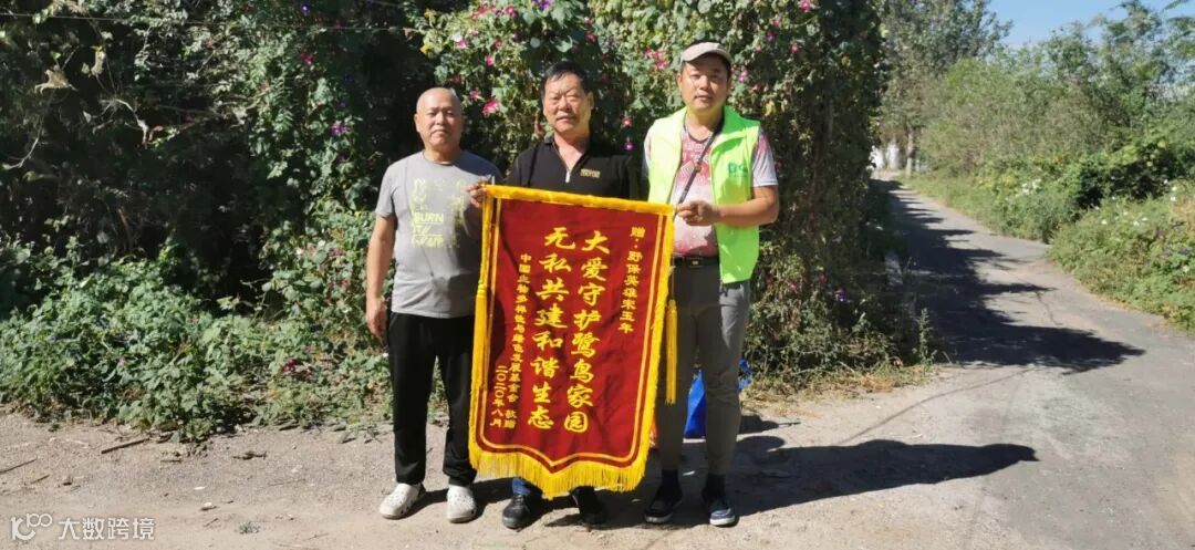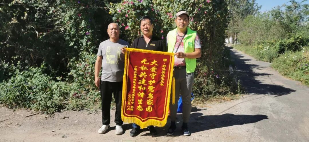 9月10日,天津护鸟志愿者特地来到鹭鸟栖息地巡访,北辰区小淀镇宋玉年,多年出人出力保护鹭鸟栖息地,中国生物多样性保护与绿色发展基金会(简称:绿发会)为宋玉年的大爱行为特发锦旗。志愿者代绿发会将锦旗颁发给宋老板。