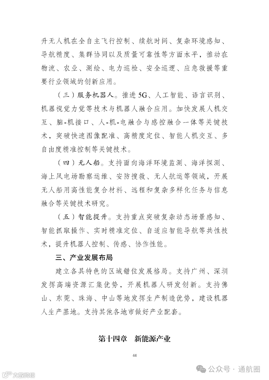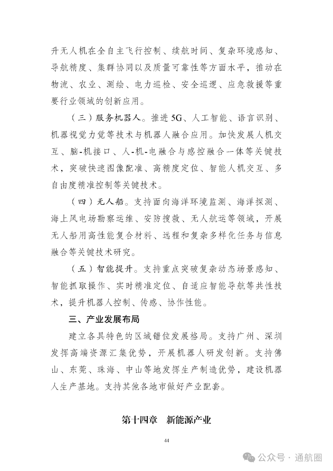 (二)无人机。突破高性能无人机的专用芯片、飞控系统、动力系统、传感器、数据链、图传系统等技术。提升无人机在全自主飞行控制、续航时间、复杂环境感知、导航精度、集群协同以及质量可靠性等方面水平,推动在物流、农业、测绘、电力巡检、安全巡逻、应急救援等重要行业领域的创新应用。