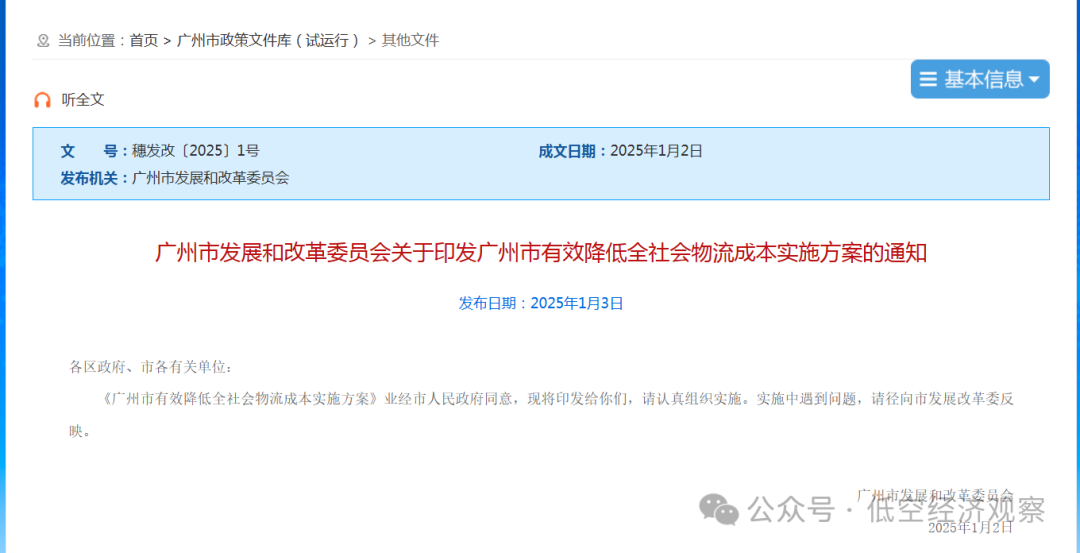 创新发展物流新质生产力。支持物流企业科技创新,加强智能汽车、智能船舶、无人机、低空飞行器、工业机器人等新型运载装备和智能产品研发及应用。积极推动广州南高铁快运基地加快规划建设,发展高铁快运、空高联运等物流新模式。支持白云机场 FBO发展,推动开展低空空域改革试验,加大低空航线申请力度,积极发展粤港澳大湾区、海南自贸港等通勤短途客货运。加快构建多场景、多主体、多层次的无人机起降点网络,研究推动将低空物流末端设施配置纳入规划管控要求。优化城市低空通信网络,保障低空飞行数据互联互通。