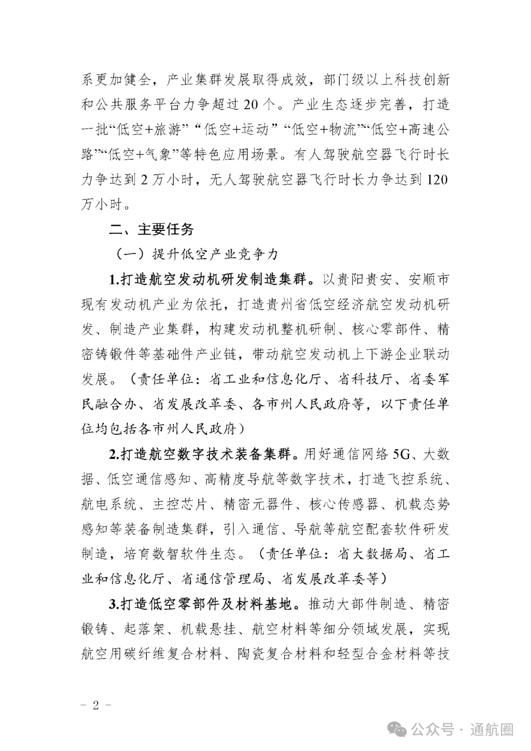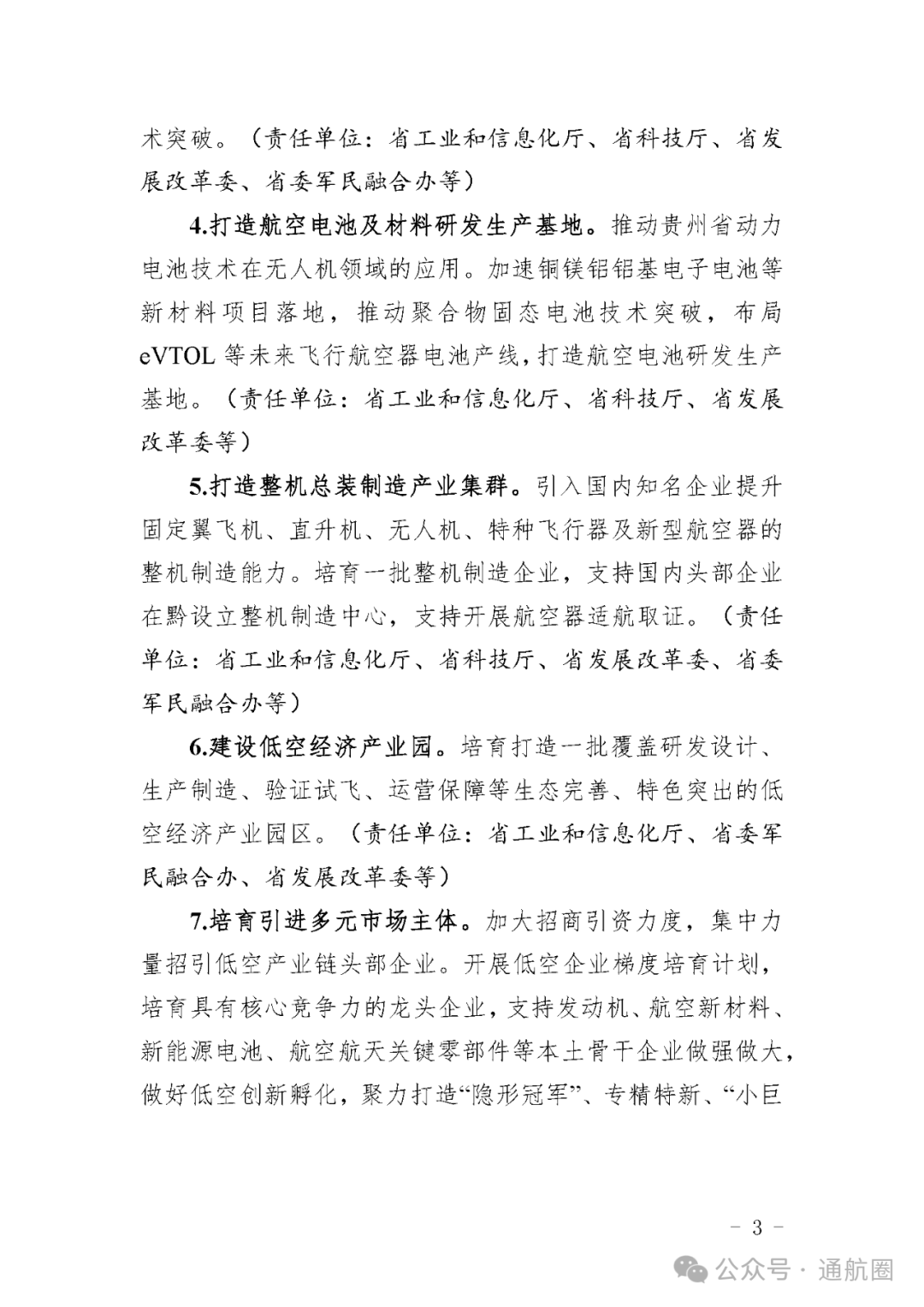 征求意见稿还专门提到了以贵阳贵安、安顺市 现有发动机产业为依托,打造贵州省低空经济航空发动机研发、制造产业集群,构建发动机整机研制、核心零部件、精 密铸锻件等基础件产业链,带动航空发动机上下游企业联动 发展。此外,打造航空数字技术装备集群、低空零部件及材料基地、航空电池及材料研发生产基地、整机总装制造产业集群。其中,在航空电池方面,推动贵州省动力 电池技术在无人机领域的应用。加速铜镁铝铝基电子电池等 新材料项目落地,推动聚合物固态电池技术突破,布局 eVTOL 等未来飞行航空器电池产线,打造航空电池研发生产 基地。