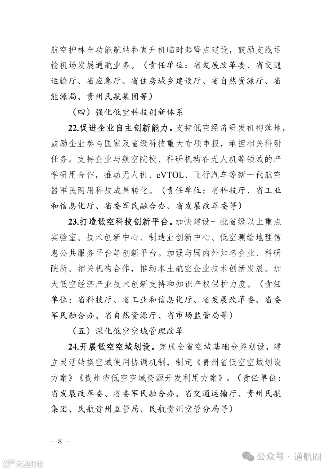 具体在低空空域改革上,贵州拟开展低空空域划设。完成全省空域基础分类划设,建 立灵活转换空域使用协调机制,制定《贵州省低空空域划设 方案》《贵州省低空空域资源开发利用方案》。构建低空飞行航线网。综合考虑应用场景拓展需要, 与军民航相关部门,制定发布目视飞行航图,划设与空域资源、航路设计匹配的低空飞行航线。提升低空飞行安全管控能力。利用省级低空一体化监 管服务平台,建立快速预警、精准识别、有效处置的低空安防解决方案。推动无人机反制技术研发、生产、应用。建立健全飞行准入、飞行监管、空地安全等标准和规范,完善山地特色地方标准制定,保证低空飞行运行安全。