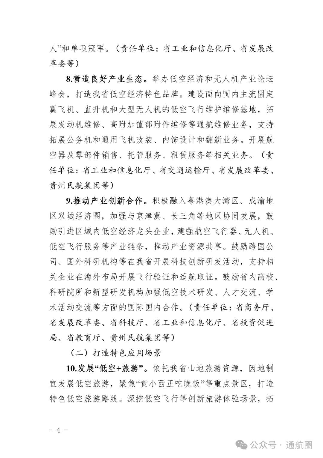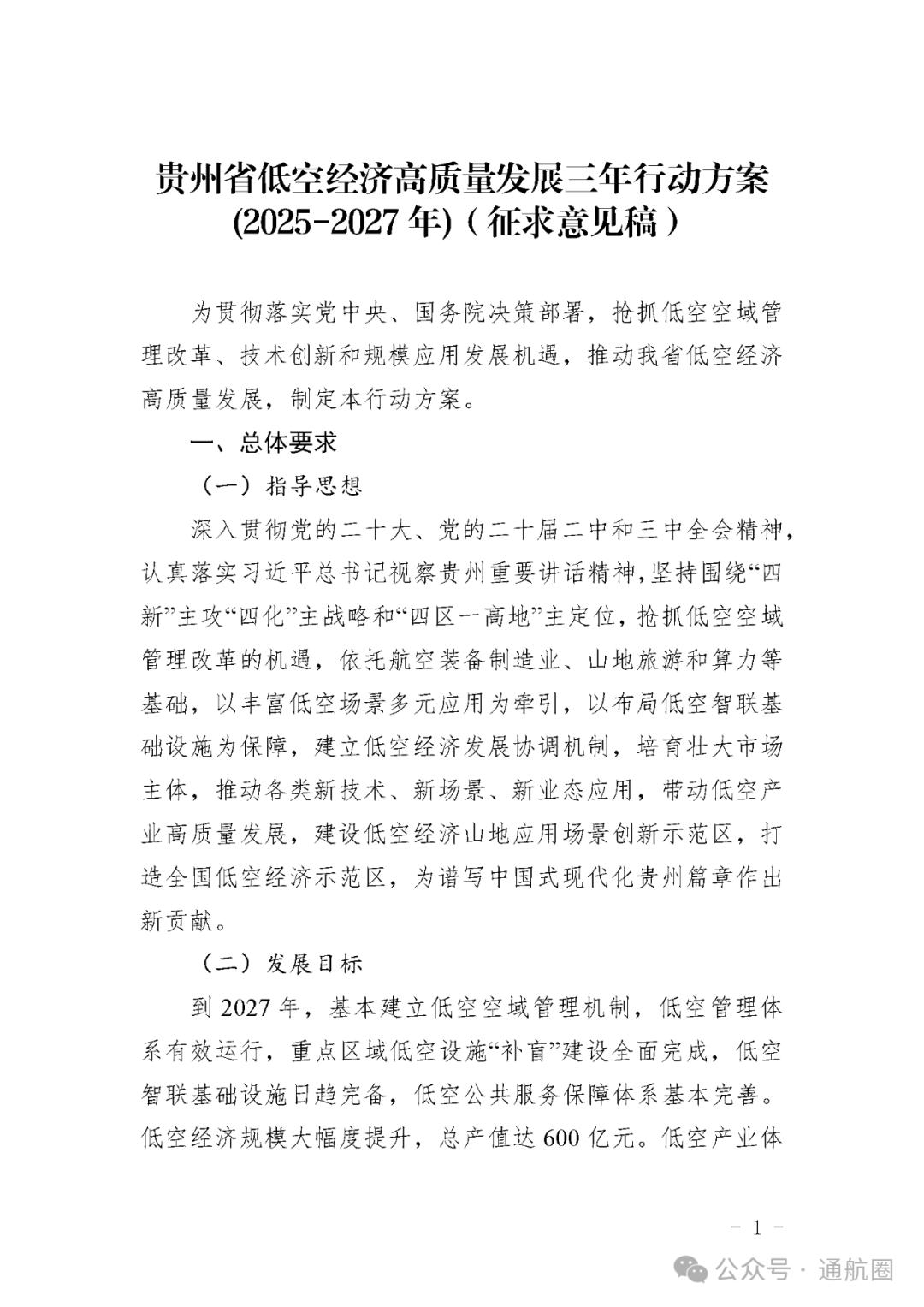 而据通航圈获悉,为推动贵州省低空经济高质量发展,贵州省发改委会同有关单位和部门起草了《贵州省低空经济高质量发展三年行动方案(2025-2027年)(征求意见稿)》,其中提出深化低空空域管理改革,建设全省低空一体化监管服务平台,因地制宜建设简易型通用机场或飞行营地,打造 一批“低空+旅游”“低空+运动”“低空+物流”“低空+高速公 路”“低空+气象”等特色应用场景。有人驾驶航空器飞行时长 力争达到2万小时,无人驾驶航空器飞行时长力争达到120 万小时,到2027年低空经济总产值达600亿元。