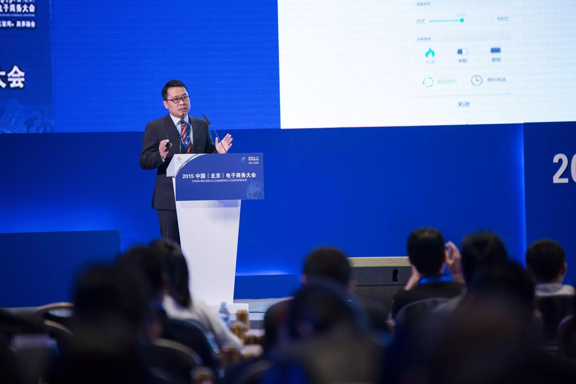 2015年10月12日,中国(北京)电子商务大会在北京国家会议中心召开。大会以“互联网+ 跨界融合”为主题,突出高端化、专业化和品牌化,展示国内外最新“互联网+”创新成果,新服务和新模式。在会上,京东智能总裁王振辉发表了《顺势而为舞在风口》的演讲,分享了京东智能在“互联网+”风口下对传统行业、初创企业的融合改造。他认为京东智能通过打造京东微联App为用户带来互联互通的生活体验,而JD+开放生态,则为初创企业、传统企业的智能化转型提供了价值,推动它们走向成功。