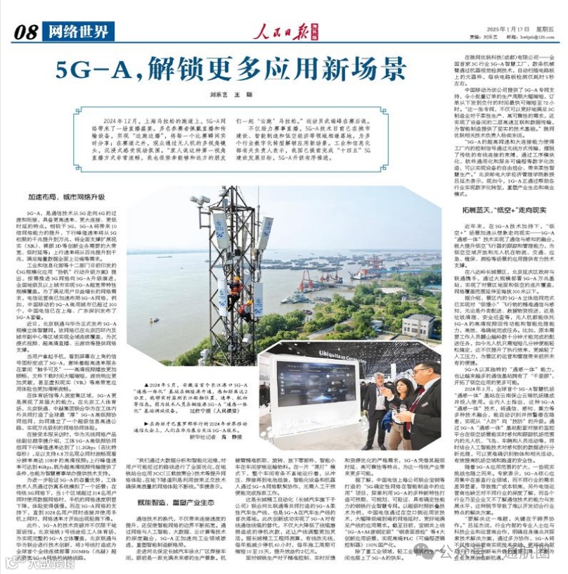 1月17日,《人民日报海外版》刊发文章《5G-A,解锁更多应用新场景》。文章介绍,5G-A,是通信技术从5G走向6G的过渡和衔接,具备更高速率、更大连接、更低时延的特点。5G-A技术目前已在城市建设、智能制造和低空经济等领域相继落地,为多个行业数字化转型解锁应用新场景。工业和信息化部有关负责人表示,我国已提前完成“十四五”5G建设发展目标,5G-A升级有序推进。