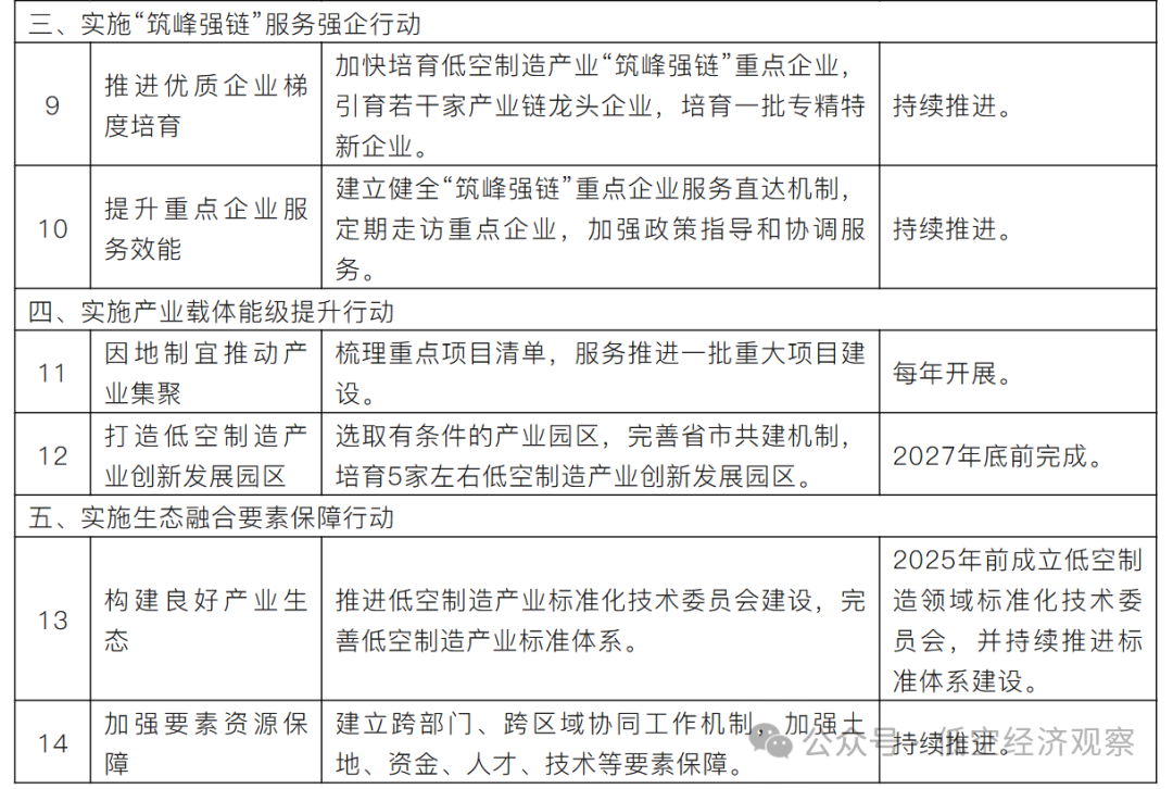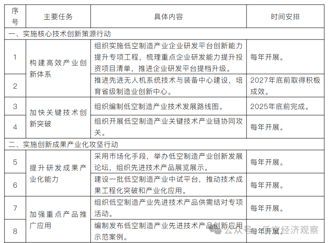 《行动方案》明确了低空航空器和低空信息基础设施两个重点方向,提出实施核心技术创新策源行动、实施创新成果产业化攻坚行动、实施“筑峰强链”服务强企行动、实施产业载体能级提升行动、实施生态融合要素保障行动等5项主要任务。