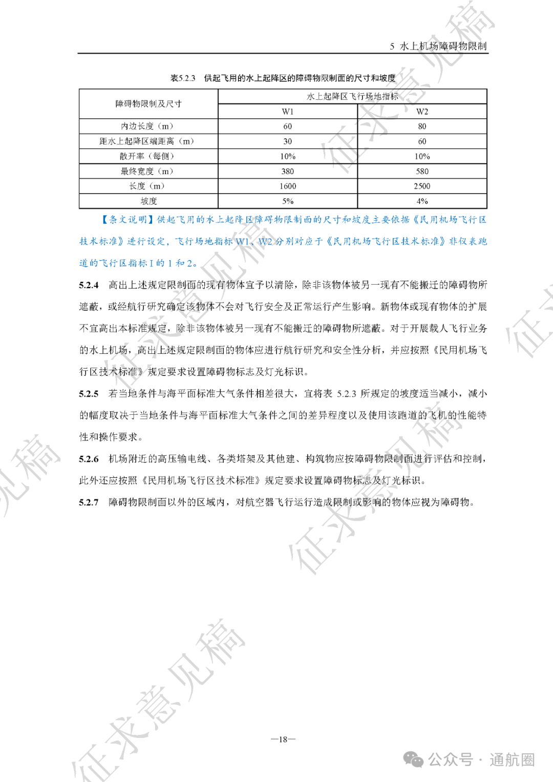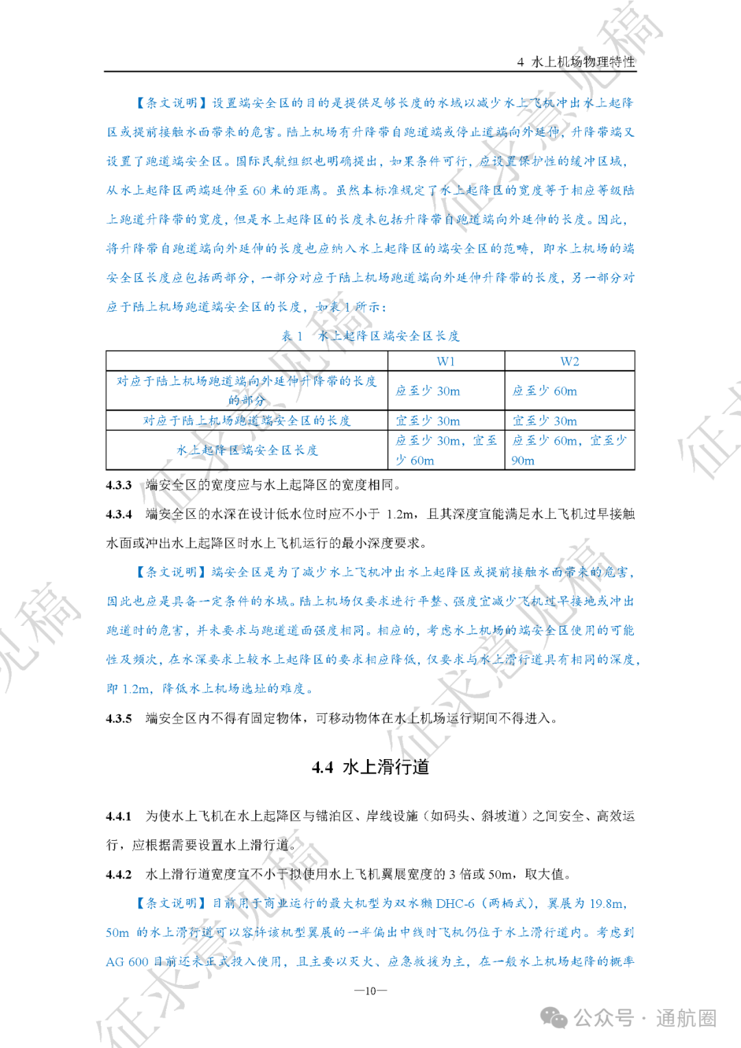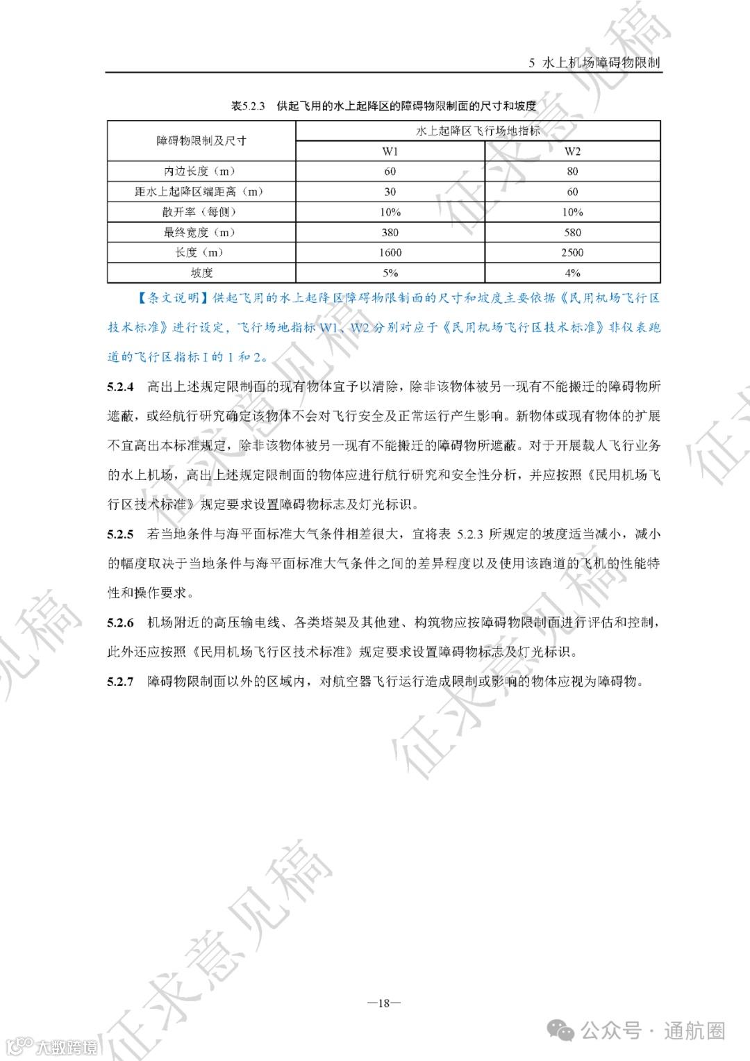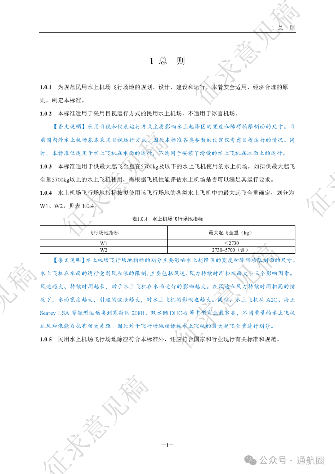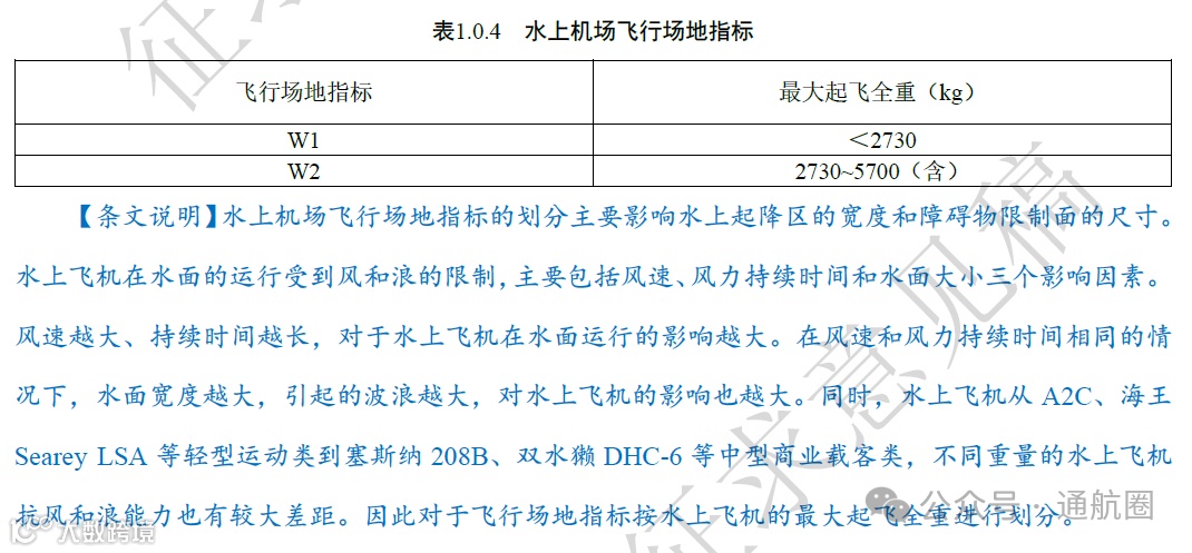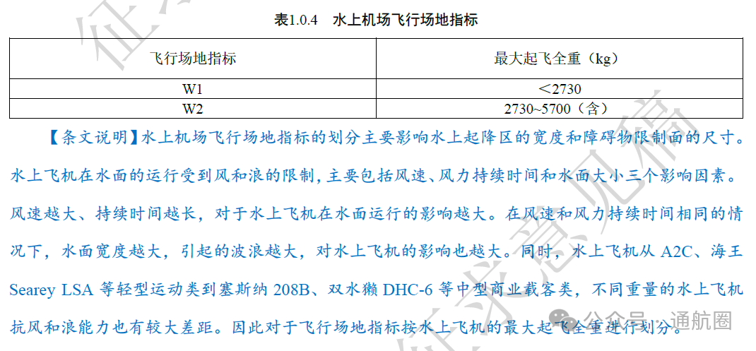 根据征求意见稿,水上机场飞行场地指标按拟使用该飞行场地的各类水上飞机中的 最大起飞全重划分为 W1、 W2级,最大起飞全重不足2730kg的为W1级。