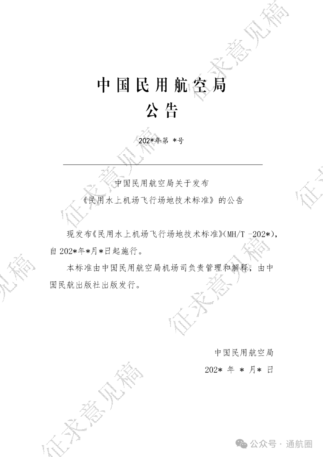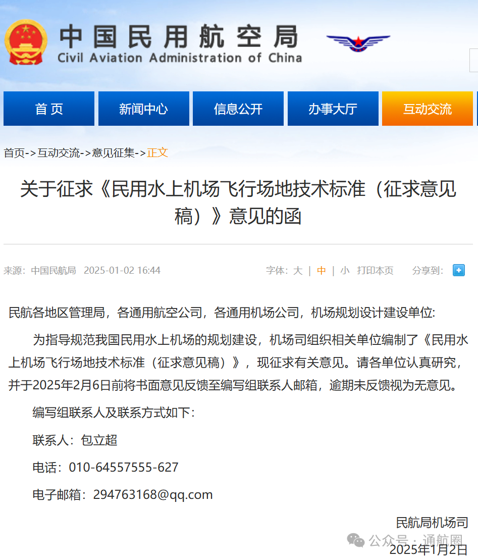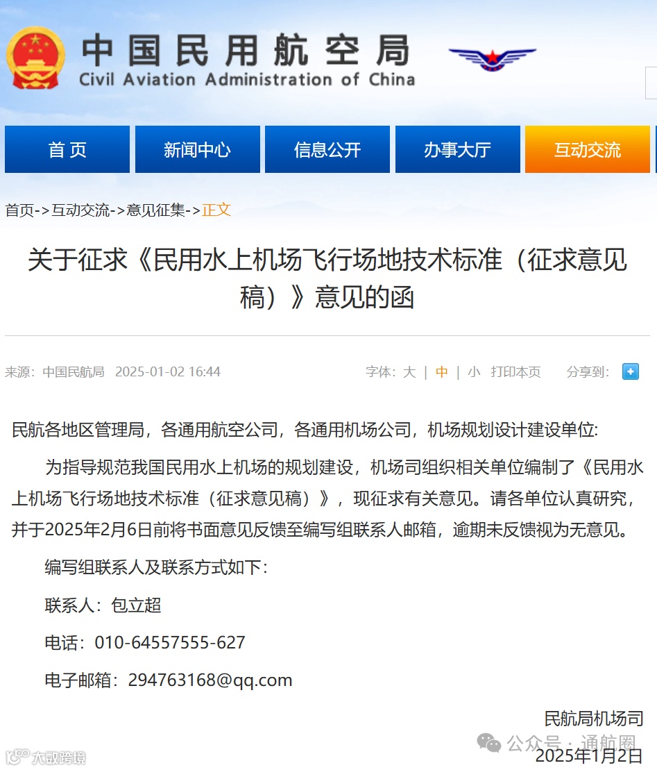 2025年1月2日,新年第一个工作日,民航局机场司发函,就《民用水上机场飞行场地技术标准(征求意见稿)》征求意见, 标准共分为7章,主要内容包括:总则、术语、水上机场数据、水上机场 物理特性、水上机场障碍物限制、目视助航设施、救援和消防等,适用于采用目视运行方式的民用水上机场,不适用于冰雪机场。标准反馈截止时间为2025年2月6日。