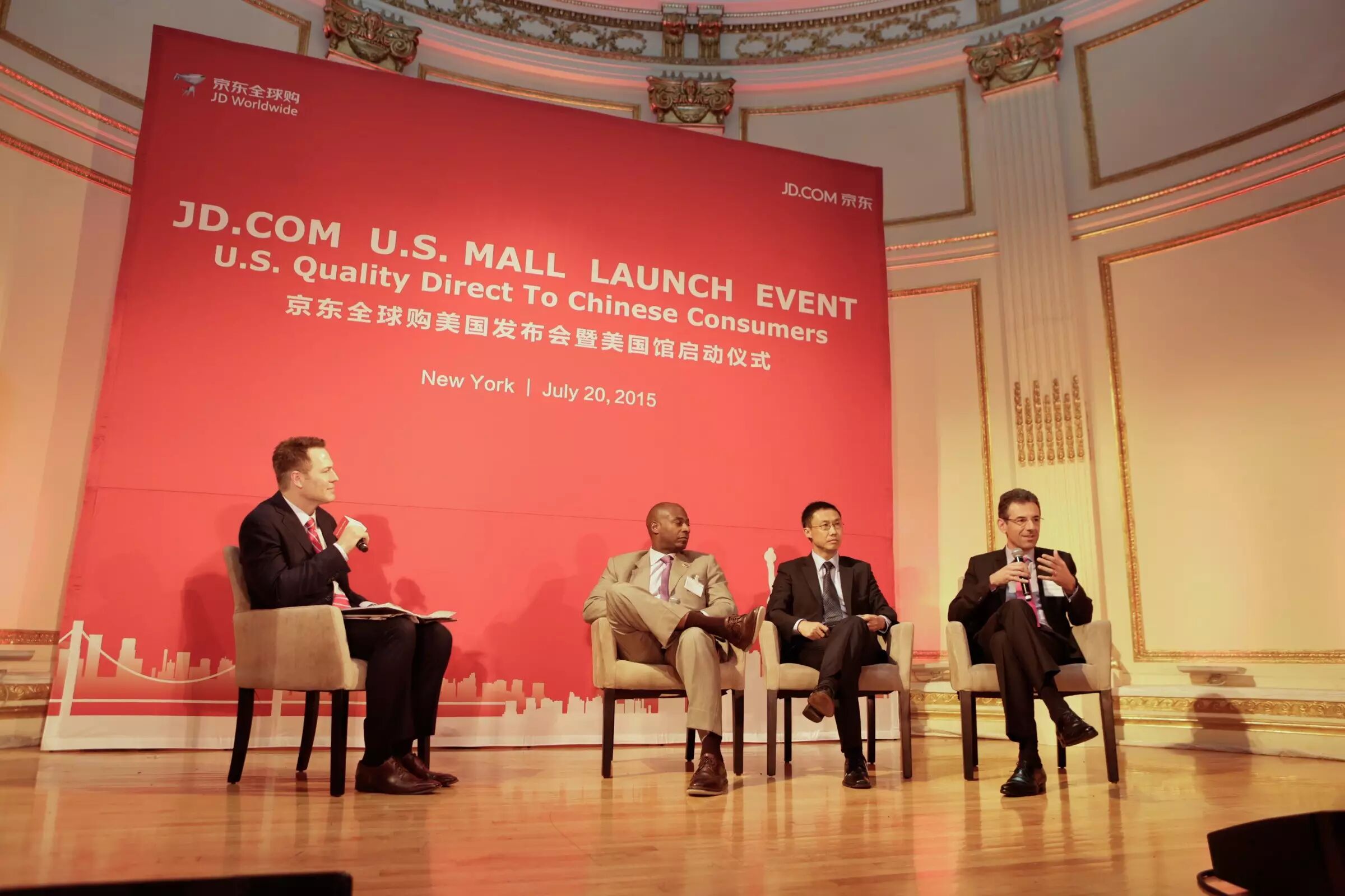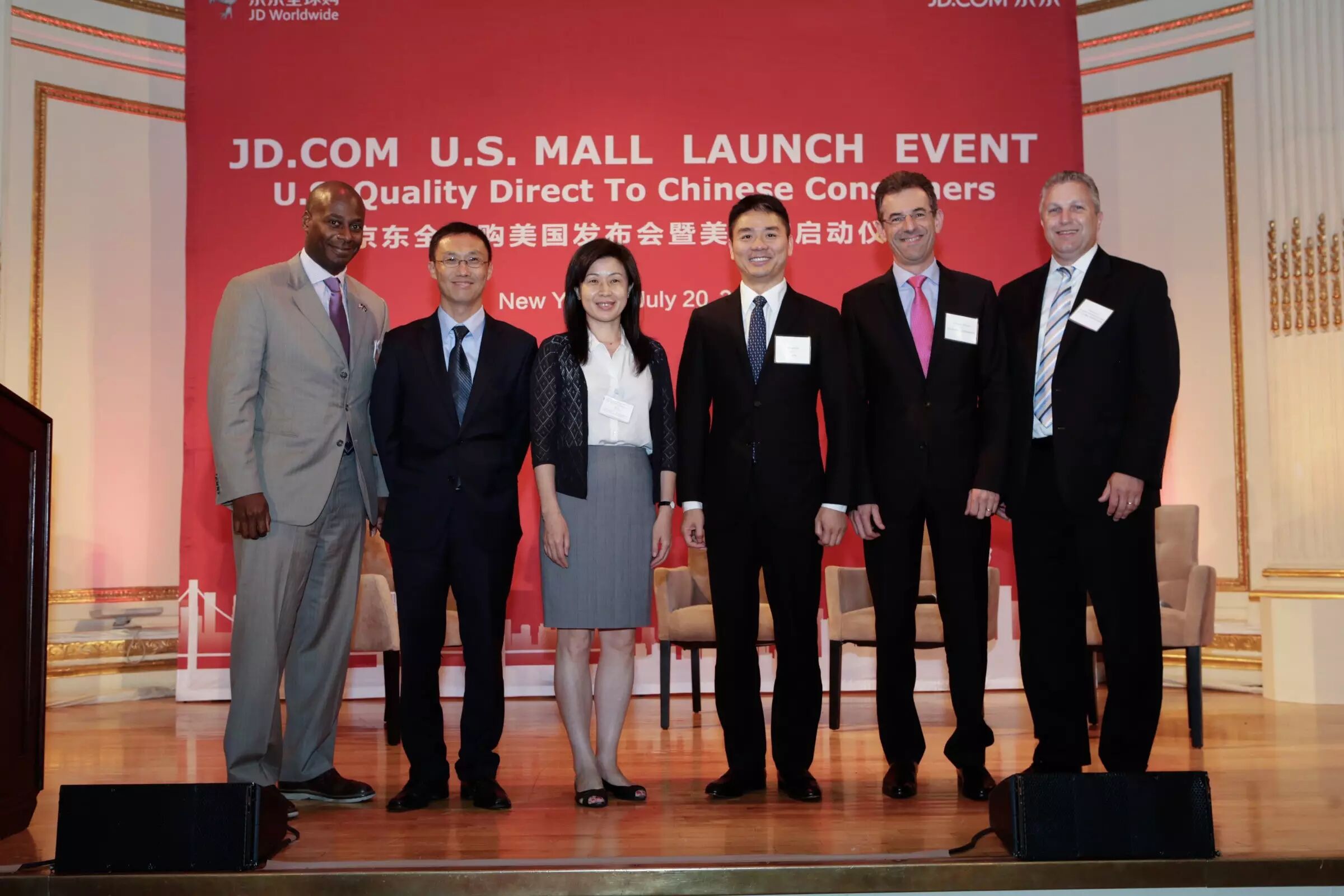 京东全球购美国招商会暨京东“美国馆”启动仪式在7月20日于美国纽约举行,京东集团CEO刘强东、京东商城CEO沈皓瑜、纽约州经济发展厅执行副总裁John Gilstrap、中国驻纽约总领事馆商务参赞刘怡、DHL全球货运美洲总裁Mathieu Floreani,以及数百位美国当地知名企业和商家代表出席了本次活动。近期,京东与Nautica Kids(诺帝卡童装)、Benetton Kids(贝纳通童装)、Converse(匡威)、 Samsonite(新秀丽) 、Ocean Spray(优鲜沛食品)等众多知名美国品牌达成合作。
