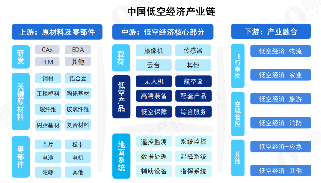 当前,低空经济产业链已初具规模,涵盖了研发设计、生产制造、运营服务等上中下游多个环节。上游包括原材料供应和核心零部件制造;中游主要是低空飞行器的制造和组装,包括无人机、直升机、电动垂直起降飞行器(eVTOL)等的设计、制造和测试;下游涉及低空飞行器的应用和服务,包括低空物流、旅游观光、农业植保、医疗救援、城市安防、航空摄影、空中巡查等多个领域。