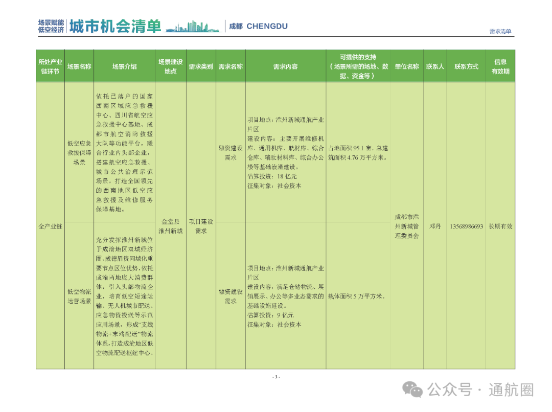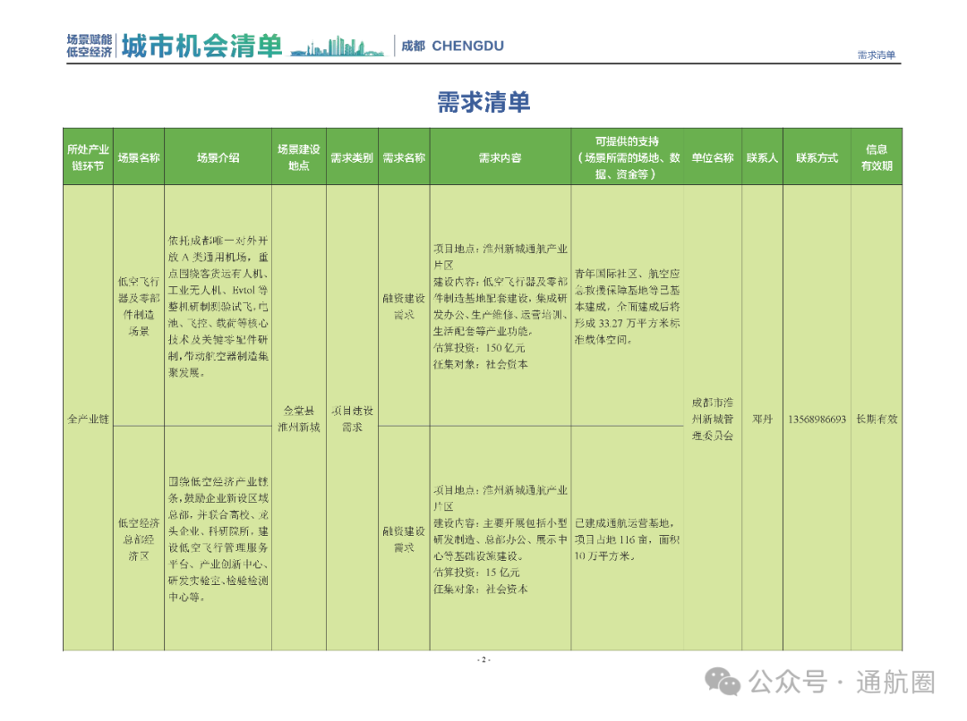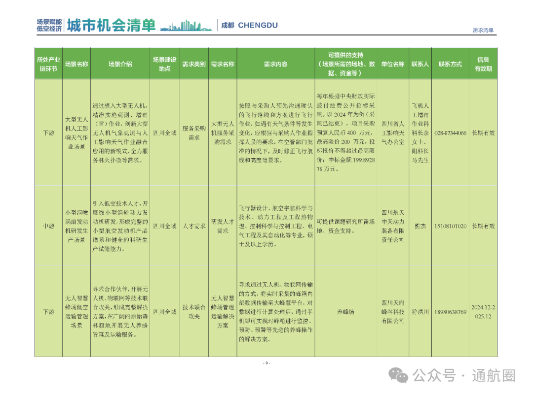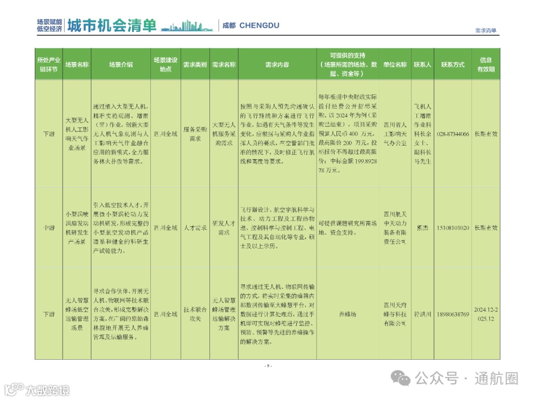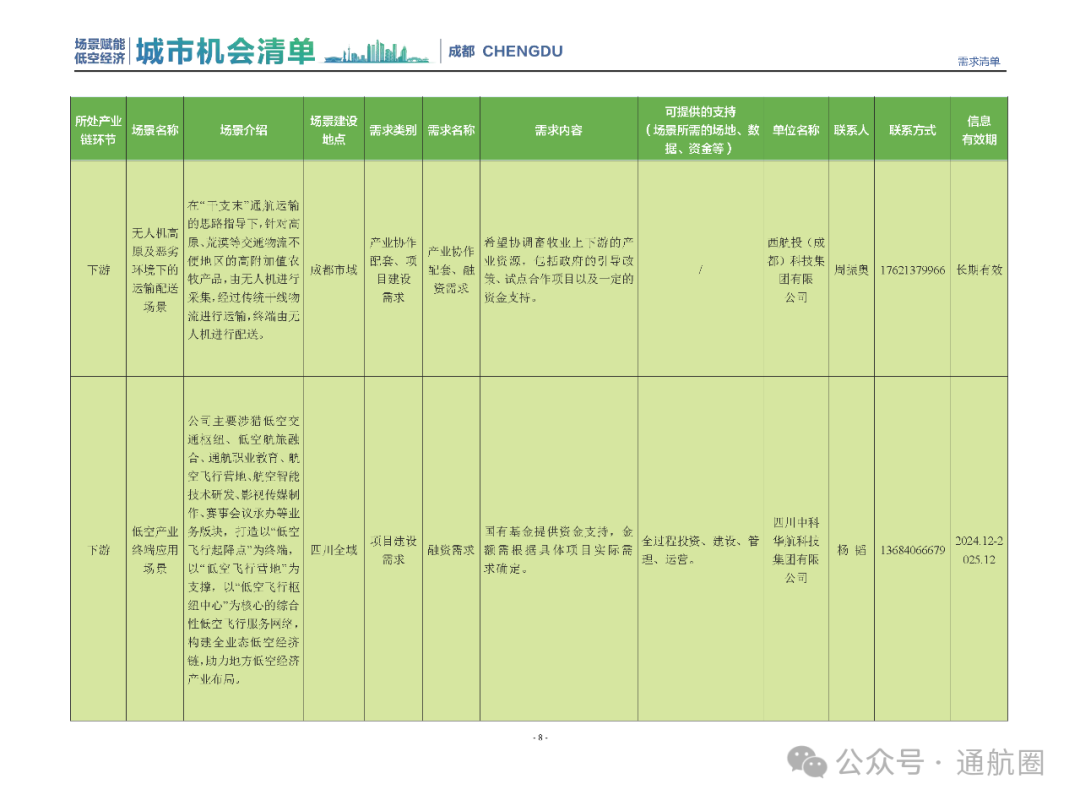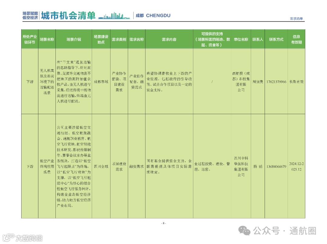 成都市经信局市新经济委总工程师代兰表示,拓展低空市场应用场景、做强低空产业支撑,是加快探索低空产业新业态新模式、开辟发展新领域新赛道的重要途径。据介绍,本批次《场景赋能低空产业城市机会清单》围绕场景赋能低空产业增长新模式,聚焦低空领域新技术新产品首发、首秀、首试、首用,以及新场景建设,梳理发布供需信息共92条(需求信息18条、供给信息74条),涉及总投资242亿元,旨在促成项目、场景、技术、需求有效对接,推动成都低空产业机会共享、场景共建、协同发展,助力打造未来经济发展新引擎。从需求方面来看,清单涵盖产业链上下游各环节的诸多场景,涉及多种类别:例如金堂县淮州新城的低空经济总部经济区项目、四川省人工影响天气办公室的大型无人机人工影响天气作业场景、西航投(成都)科技集团有限公司的无人机智慧牧场场景、四川航天中天动力装备有限责任公司的小型涡喷涡扇发动机研发生产场景,提出了产业协作配套、项目建设、技术攻关、人才引进等具体需求。