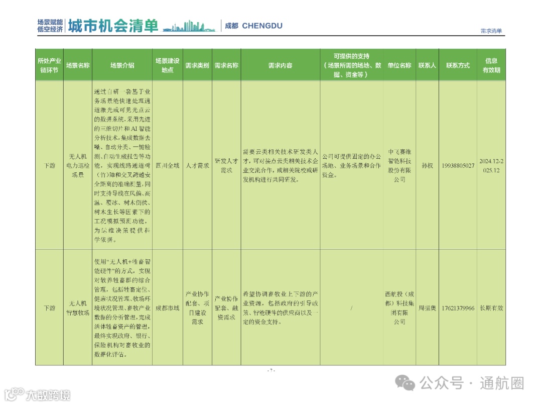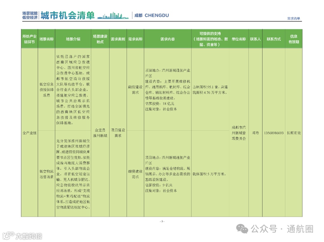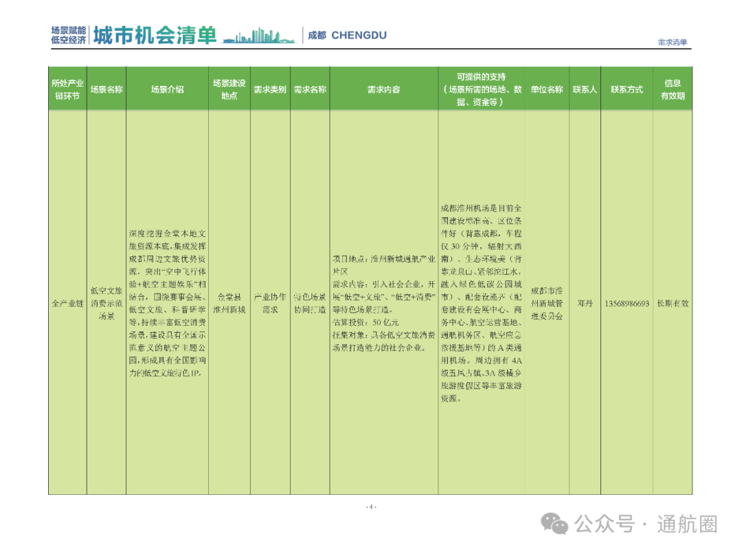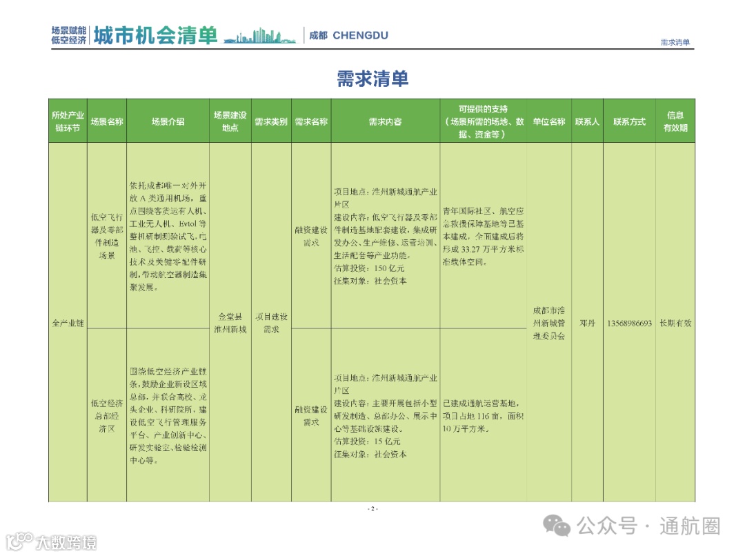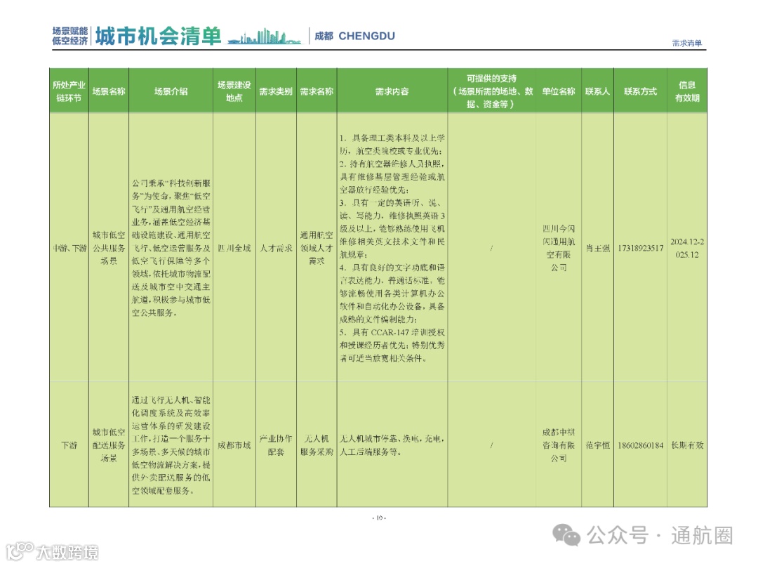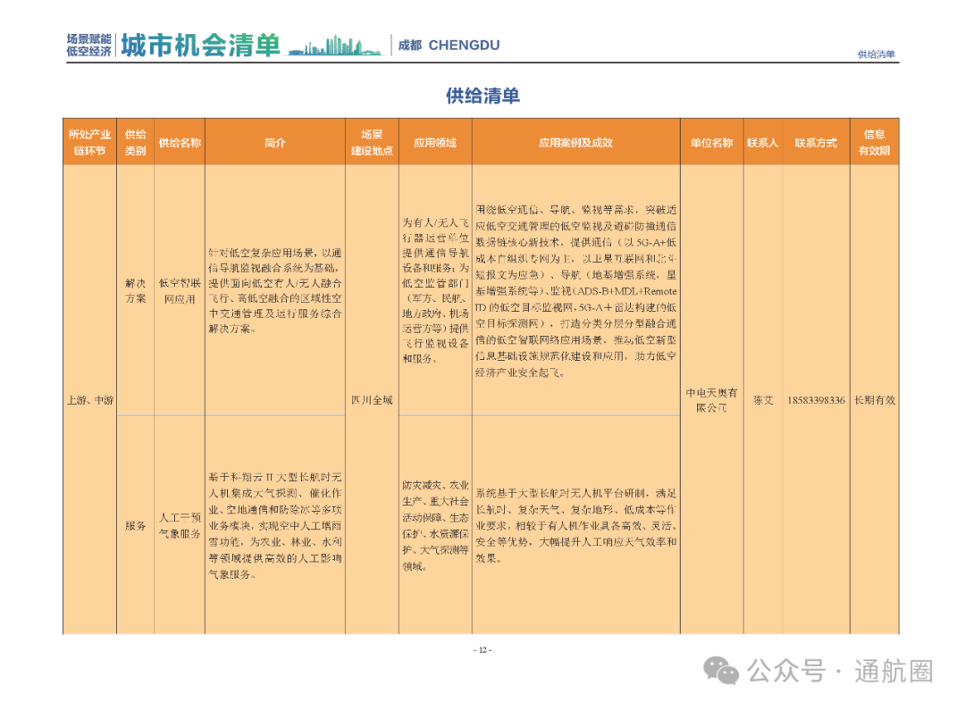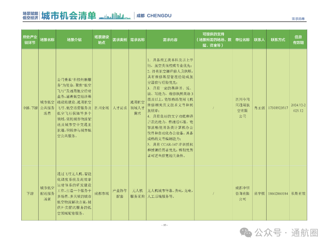 成都市经信局市新经济委总工程师代兰表示,拓展低空市场应用场景、做强低空产业支撑,是加快探索低空产业新业态新模式、开辟发展新领域新赛道的重要途径。据介绍,本批次《场景赋能低空产业城市机会清单》围绕场景赋能低空产业增长新模式,聚焦低空领域新技术新产品首发、首秀、首试、首用,以及新场景建设,梳理发布供需信息共92条(需求信息18条、供给信息74条),涉及总投资242亿元,旨在促成项目、场景、技术、需求有效对接,推动成都低空产业机会共享、场景共建、协同发展,助力打造未来经济发展新引擎。从需求方面来看,清单涵盖产业链上下游各环节的诸多场景,涉及多种类别:例如金堂县淮州新城的低空经济总部经济区项目、四川省人工影响天气办公室的大型无人机人工影响天气作业场景、西航投(成都)科技集团有限公司的无人机智慧牧场场景、四川航天中天动力装备有限责任公司的小型涡喷涡扇发动机研发生产场景,提出了产业协作配套、项目建设、技术攻关、人才引进等具体需求。
