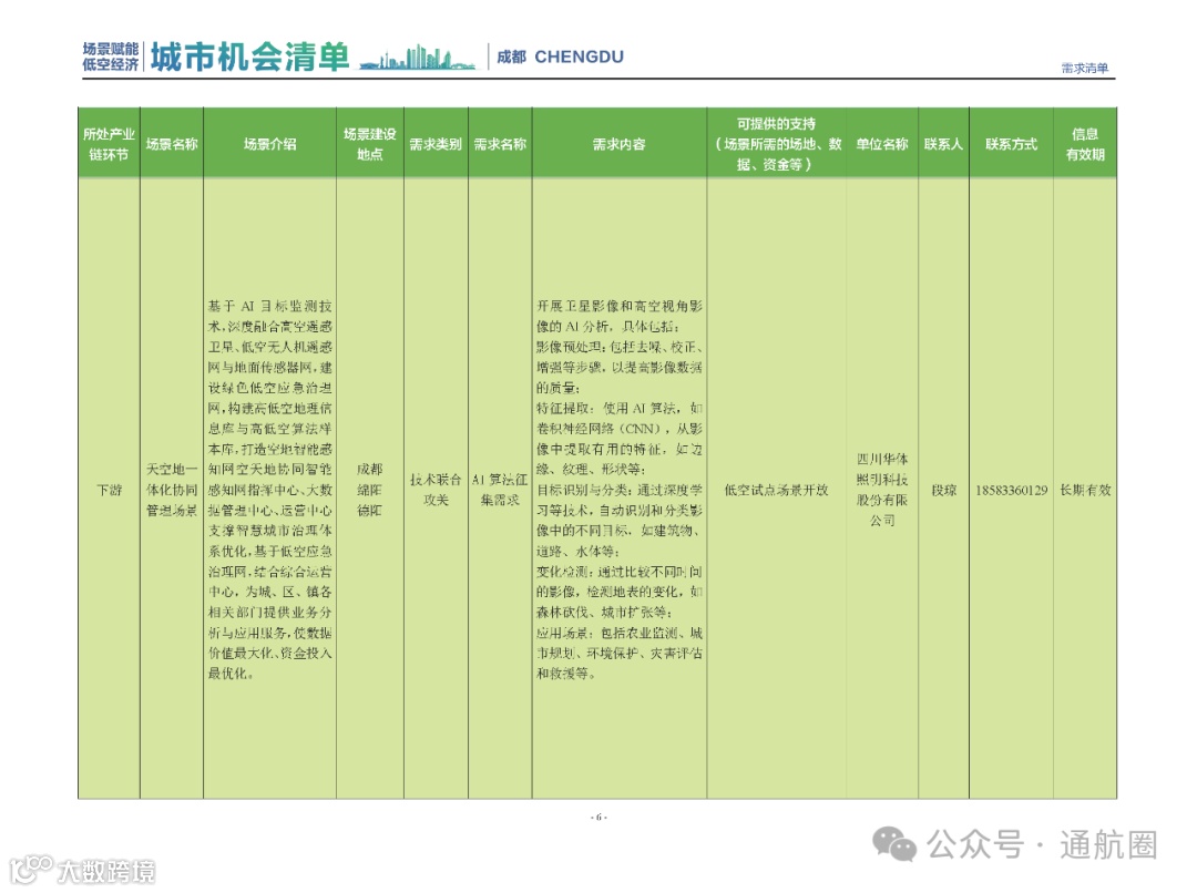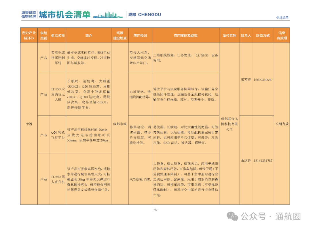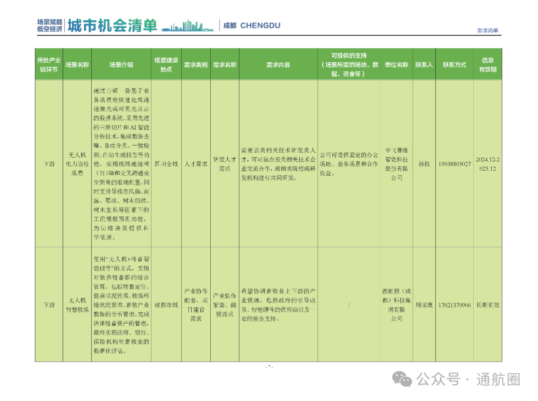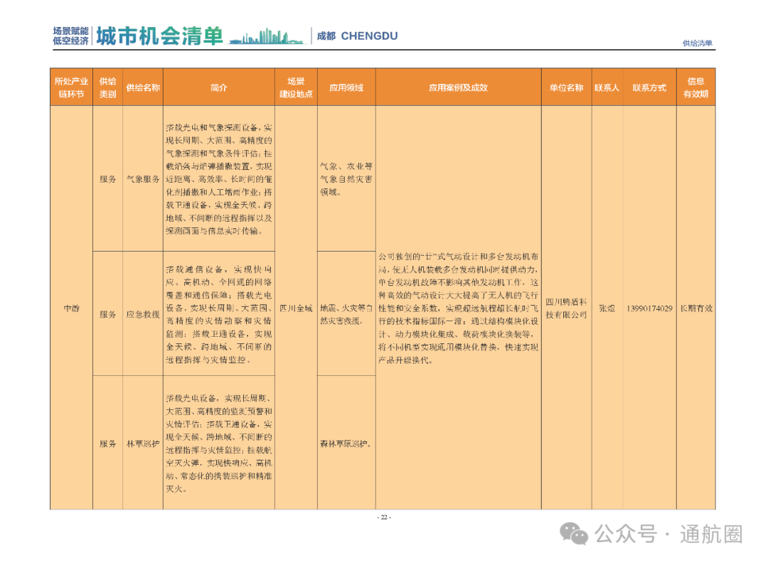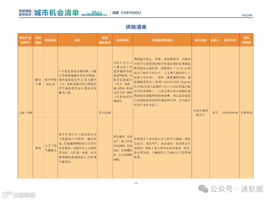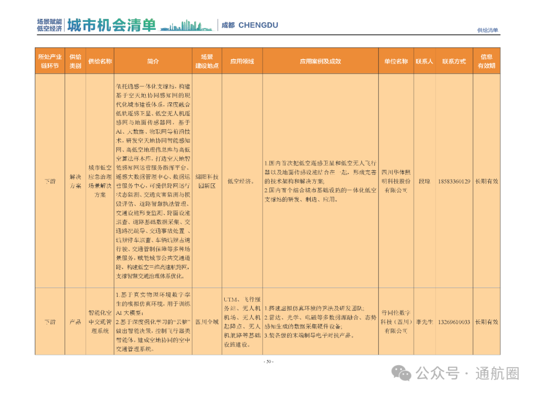 成都市经信局市新经济委总工程师代兰表示,拓展低空市场应用场景、做强低空产业支撑,是加快探索低空产业新业态新模式、开辟发展新领域新赛道的重要途径。据介绍,本批次《场景赋能低空产业城市机会清单》围绕场景赋能低空产业增长新模式,聚焦低空领域新技术新产品首发、首秀、首试、首用,以及新场景建设,梳理发布供需信息共92条(需求信息18条、供给信息74条),涉及总投资242亿元,旨在促成项目、场景、技术、需求有效对接,推动成都低空产业机会共享、场景共建、协同发展,助力打造未来经济发展新引擎。从需求方面来看,清单涵盖产业链上下游各环节的诸多场景,涉及多种类别:例如金堂县淮州新城的低空经济总部经济区项目、四川省人工影响天气办公室的大型无人机人工影响天气作业场景、西航投(成都)科技集团有限公司的无人机智慧牧场场景、四川航天中天动力装备有限责任公司的小型涡喷涡扇发动机研发生产场景,提出了产业协作配套、项目建设、技术攻关、人才引进等具体需求。