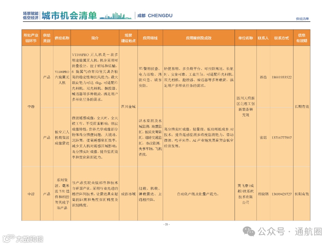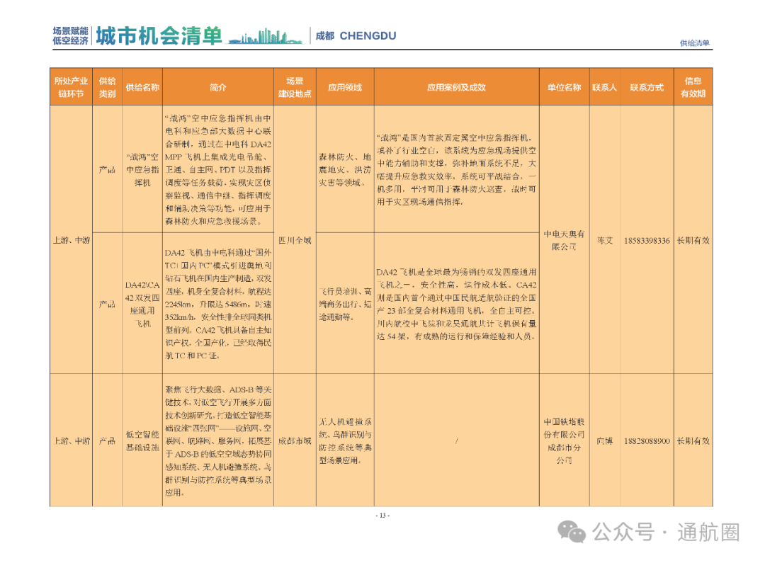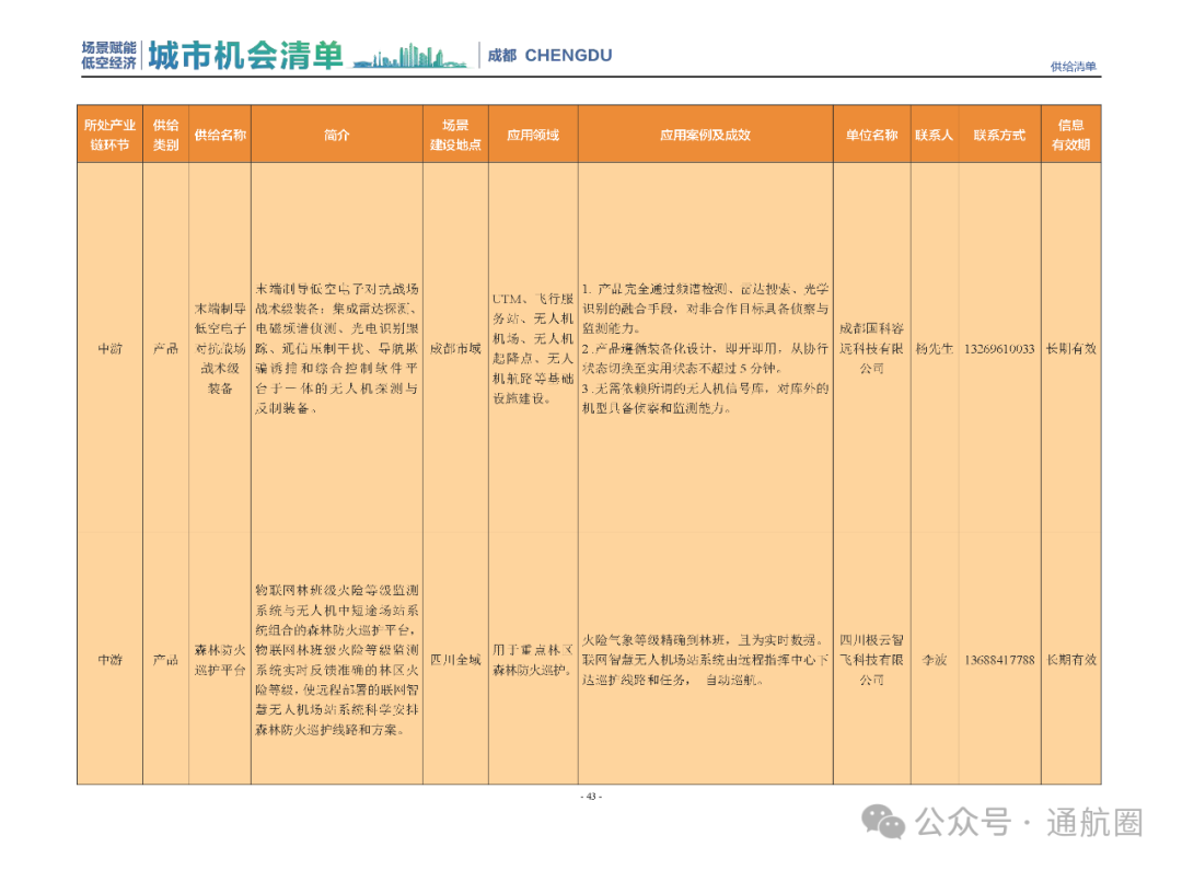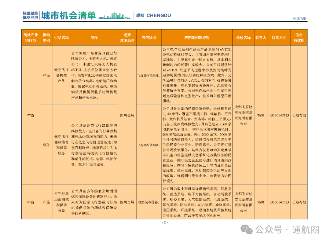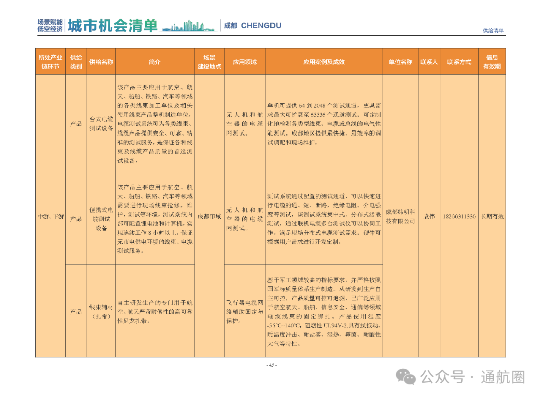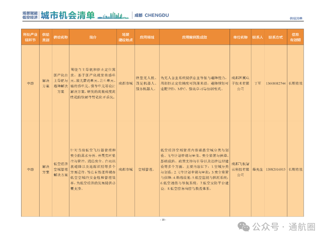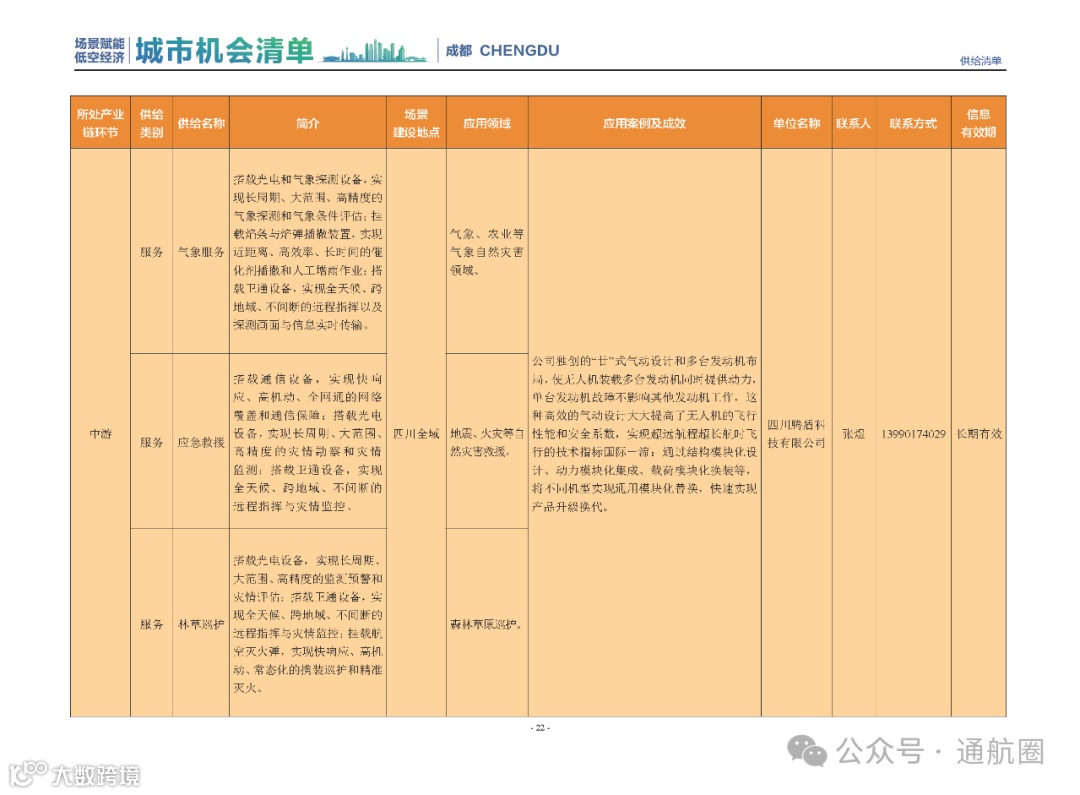 成都市经信局市新经济委总工程师代兰表示,拓展低空市场应用场景、做强低空产业支撑,是加快探索低空产业新业态新模式、开辟发展新领域新赛道的重要途径。据介绍,本批次《场景赋能低空产业城市机会清单》围绕场景赋能低空产业增长新模式,聚焦低空领域新技术新产品首发、首秀、首试、首用,以及新场景建设,梳理发布供需信息共92条(需求信息18条、供给信息74条),涉及总投资242亿元,旨在促成项目、场景、技术、需求有效对接,推动成都低空产业机会共享、场景共建、协同发展,助力打造未来经济发展新引擎。从需求方面来看,清单涵盖产业链上下游各环节的诸多场景,涉及多种类别:例如金堂县淮州新城的低空经济总部经济区项目、四川省人工影响天气办公室的大型无人机人工影响天气作业场景、西航投(成都)科技集团有限公司的无人机智慧牧场场景、四川航天中天动力装备有限责任公司的小型涡喷涡扇发动机研发生产场景,提出了产业协作配套、项目建设、技术攻关、人才引进等具体需求。