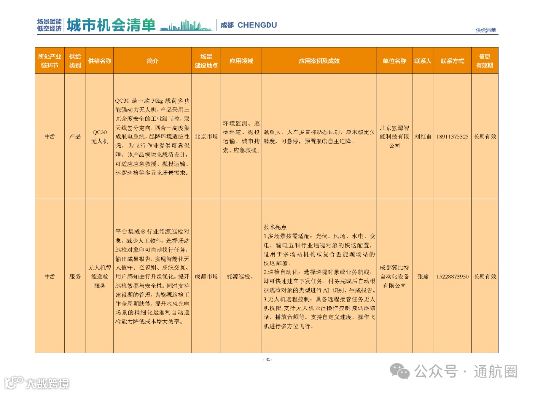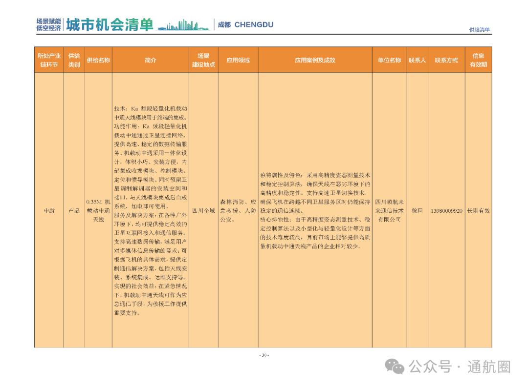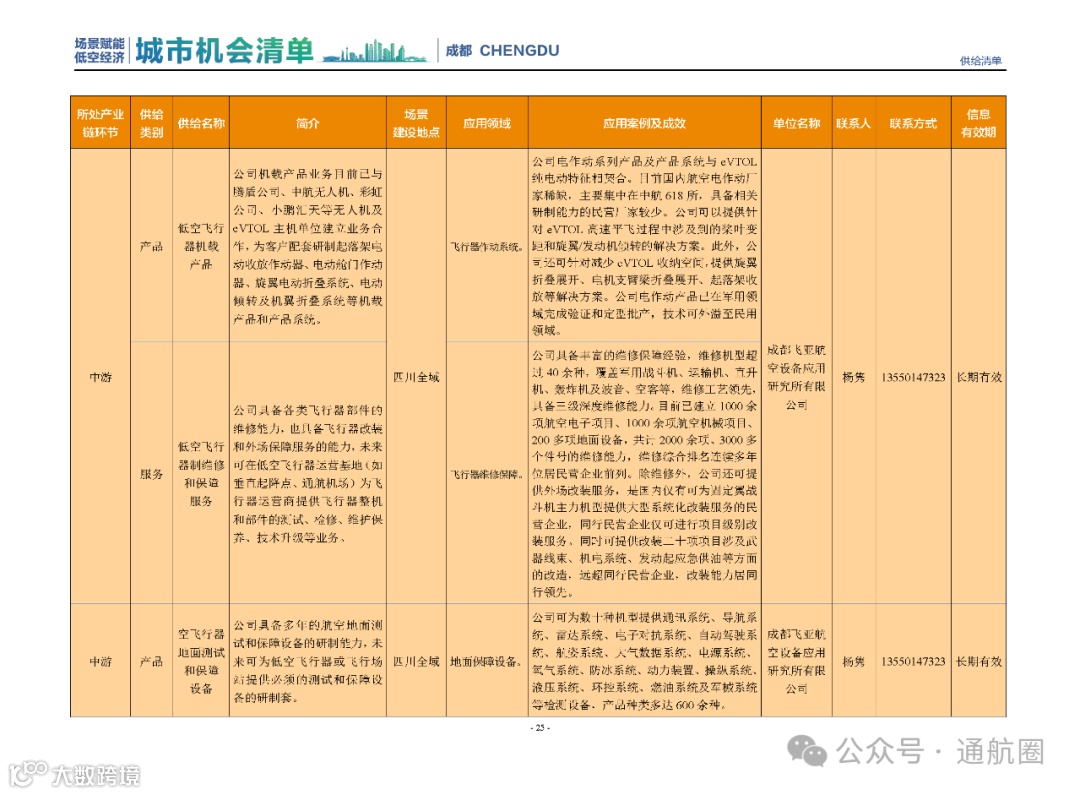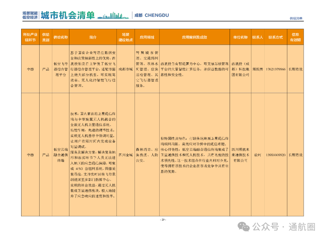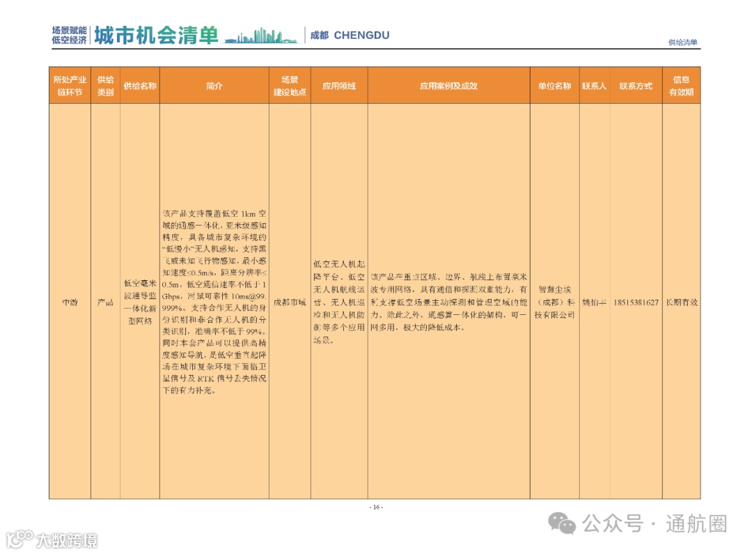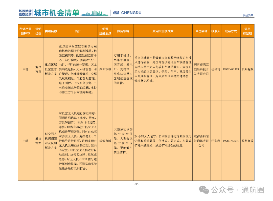 成都市经信局市新经济委总工程师代兰表示,拓展低空市场应用场景、做强低空产业支撑,是加快探索低空产业新业态新模式、开辟发展新领域新赛道的重要途径。据介绍,本批次《场景赋能低空产业城市机会清单》围绕场景赋能低空产业增长新模式,聚焦低空领域新技术新产品首发、首秀、首试、首用,以及新场景建设,梳理发布供需信息共92条(需求信息18条、供给信息74条),涉及总投资242亿元,旨在促成项目、场景、技术、需求有效对接,推动成都低空产业机会共享、场景共建、协同发展,助力打造未来经济发展新引擎。从需求方面来看,清单涵盖产业链上下游各环节的诸多场景,涉及多种类别:例如金堂县淮州新城的低空经济总部经济区项目、四川省人工影响天气办公室的大型无人机人工影响天气作业场景、西航投(成都)科技集团有限公司的无人机智慧牧场场景、四川航天中天动力装备有限责任公司的小型涡喷涡扇发动机研发生产场景,提出了产业协作配套、项目建设、技术攻关、人才引进等具体需求。