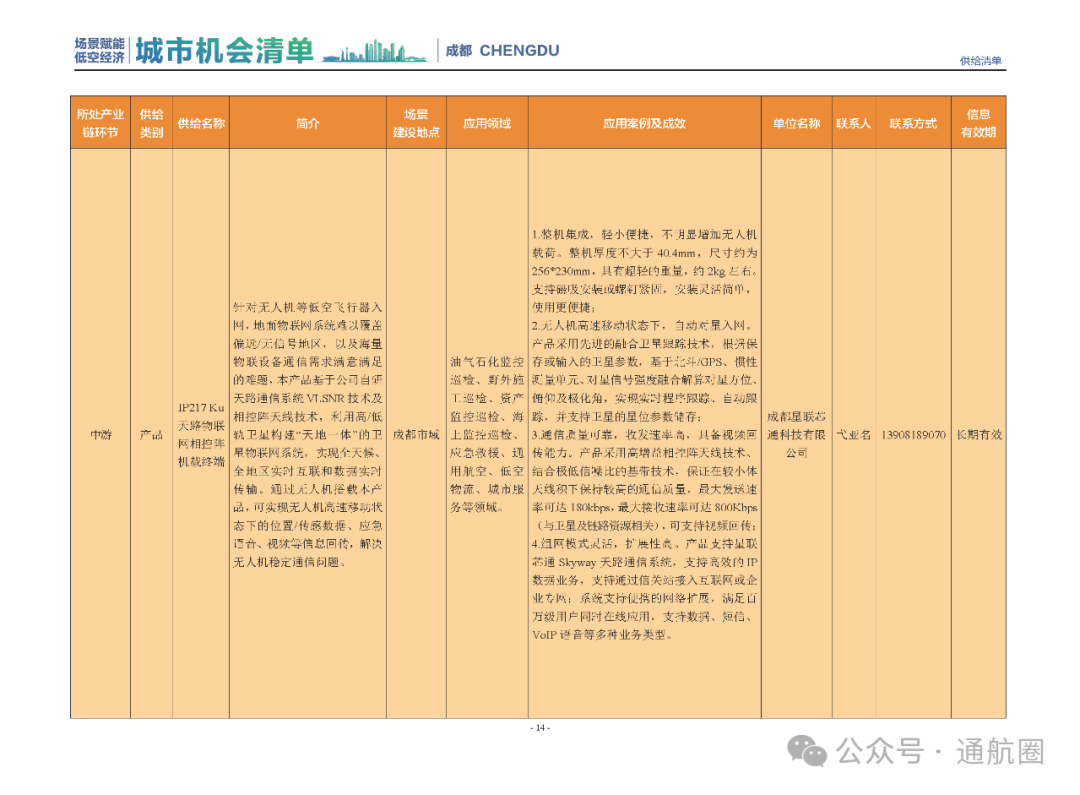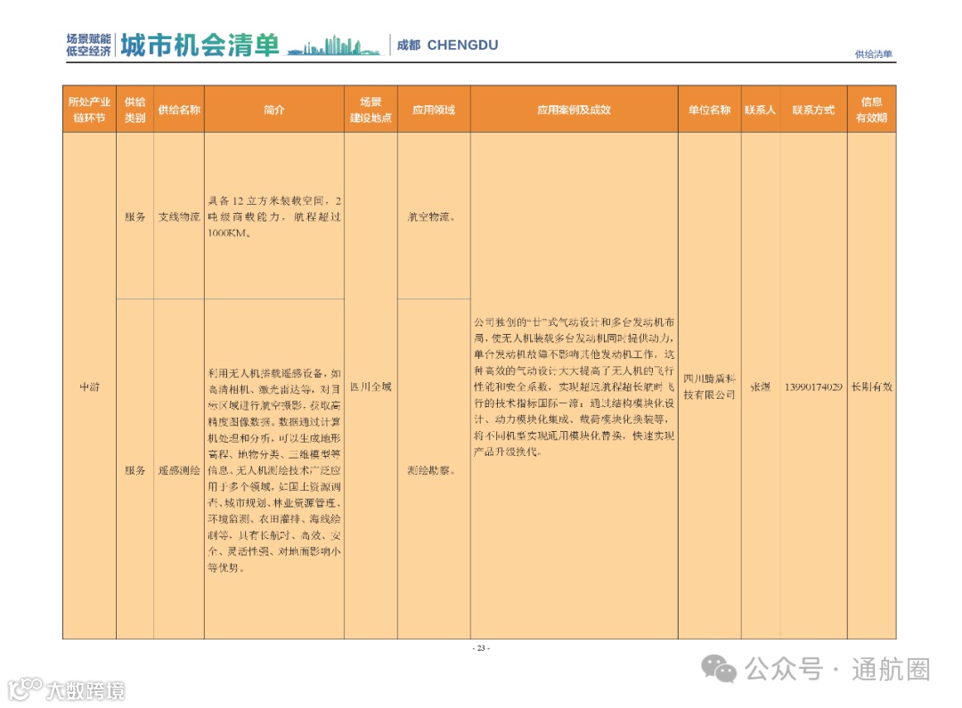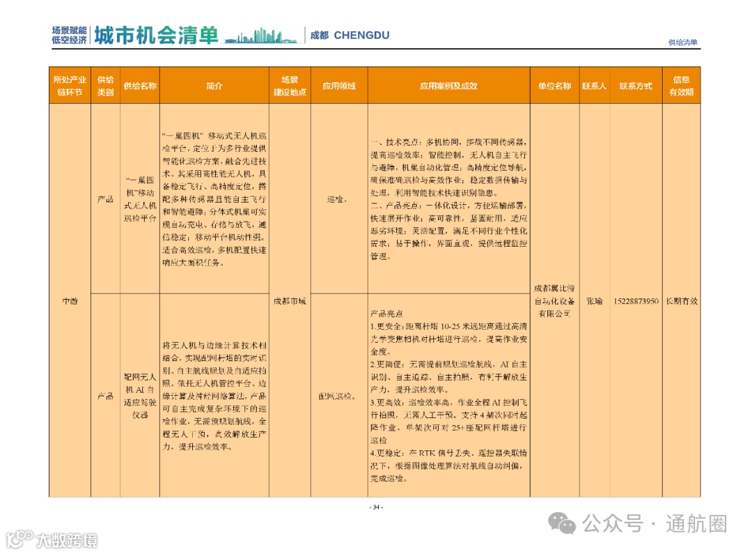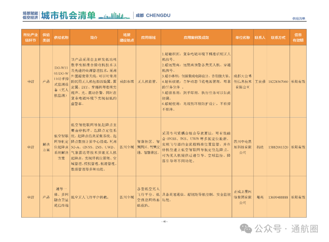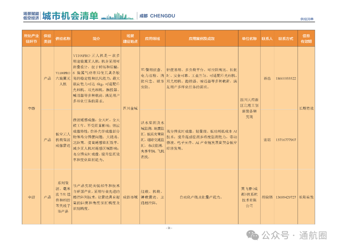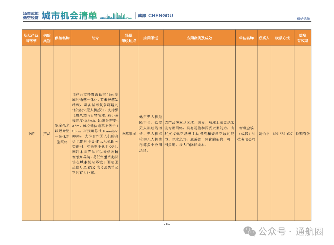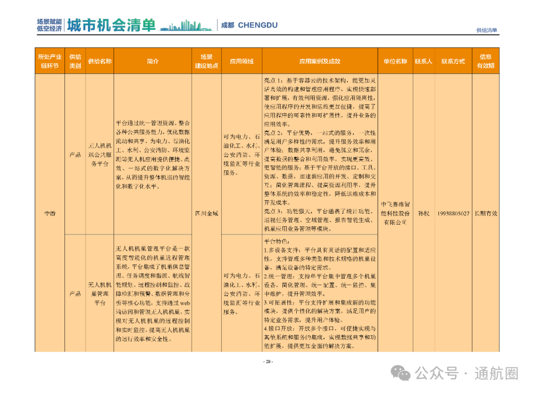 成都市经信局市新经济委总工程师代兰表示,拓展低空市场应用场景、做强低空产业支撑,是加快探索低空产业新业态新模式、开辟发展新领域新赛道的重要途径。据介绍,本批次《场景赋能低空产业城市机会清单》围绕场景赋能低空产业增长新模式,聚焦低空领域新技术新产品首发、首秀、首试、首用,以及新场景建设,梳理发布供需信息共92条(需求信息18条、供给信息74条),涉及总投资242亿元,旨在促成项目、场景、技术、需求有效对接,推动成都低空产业机会共享、场景共建、协同发展,助力打造未来经济发展新引擎。从需求方面来看,清单涵盖产业链上下游各环节的诸多场景,涉及多种类别:例如金堂县淮州新城的低空经济总部经济区项目、四川省人工影响天气办公室的大型无人机人工影响天气作业场景、西航投(成都)科技集团有限公司的无人机智慧牧场场景、四川航天中天动力装备有限责任公司的小型涡喷涡扇发动机研发生产场景,提出了产业协作配套、项目建设、技术攻关、人才引进等具体需求。