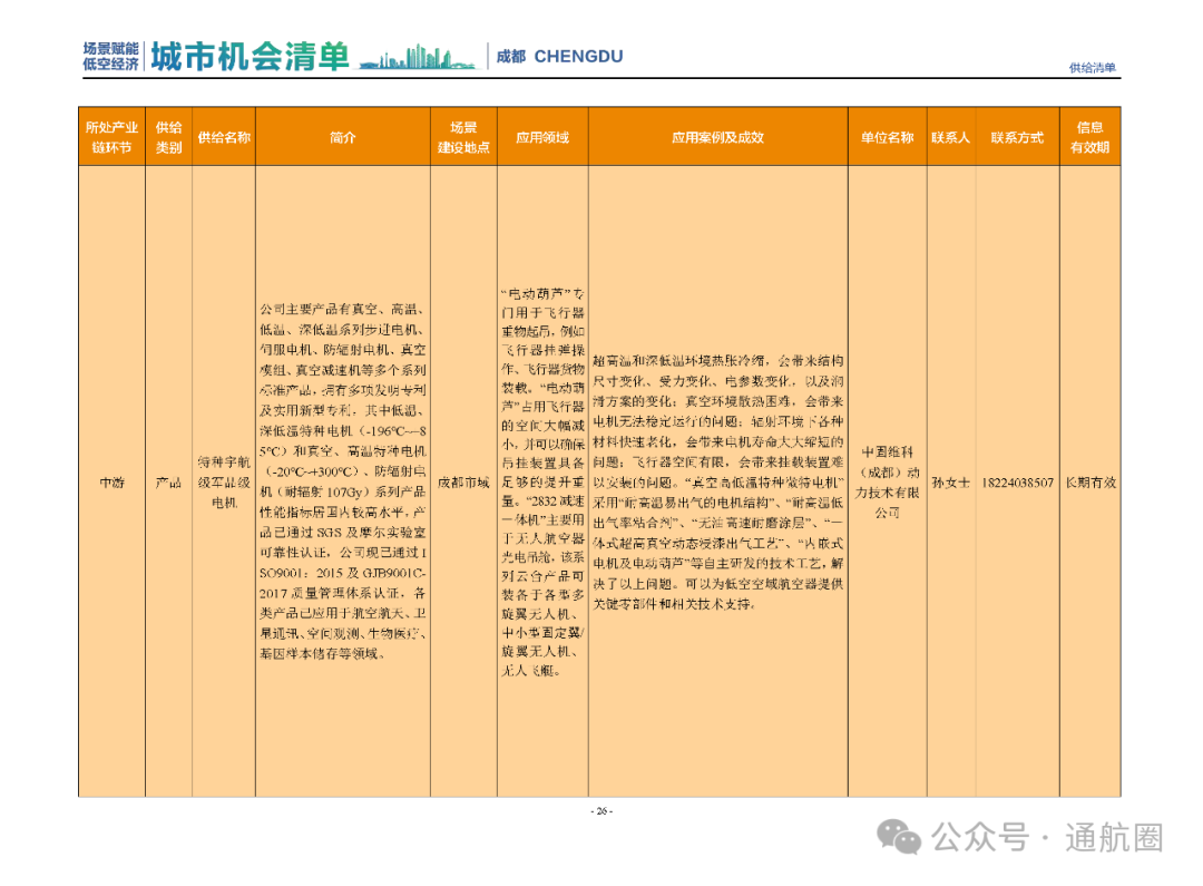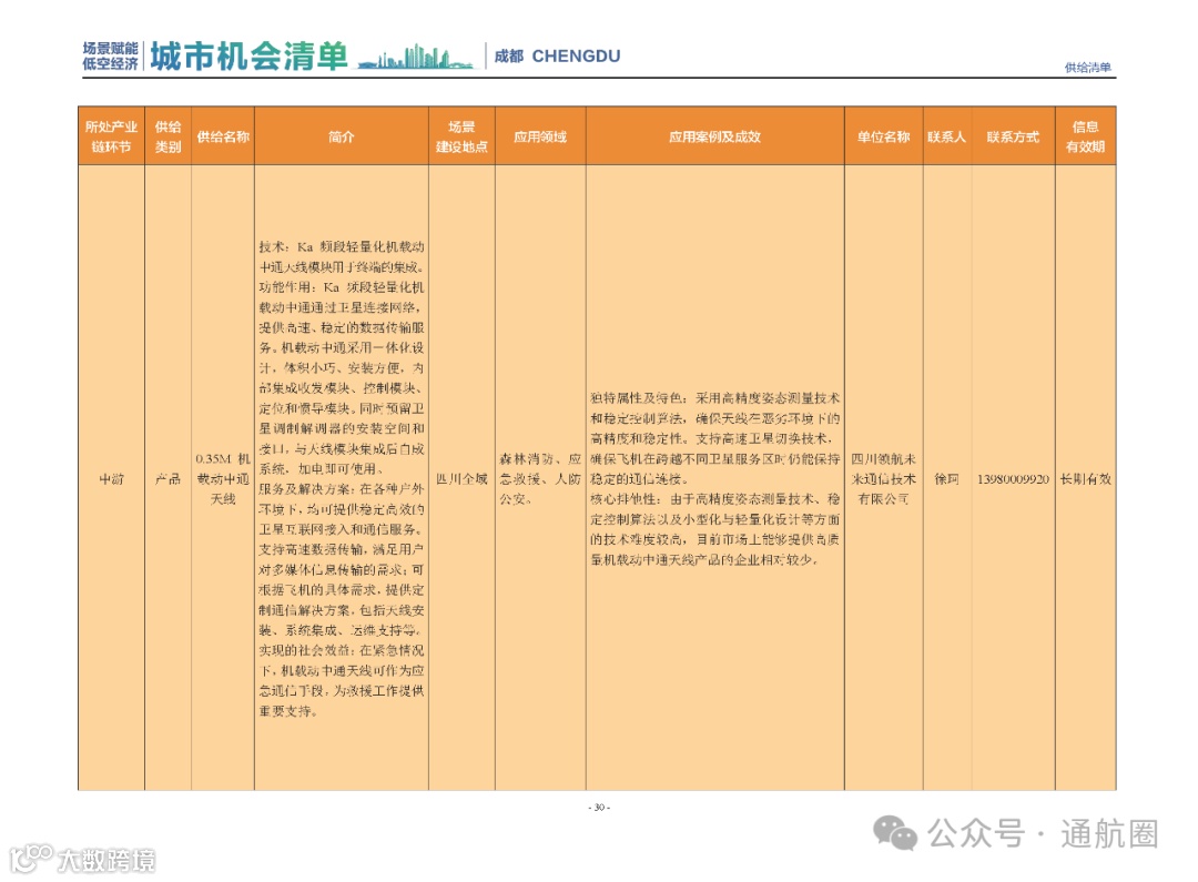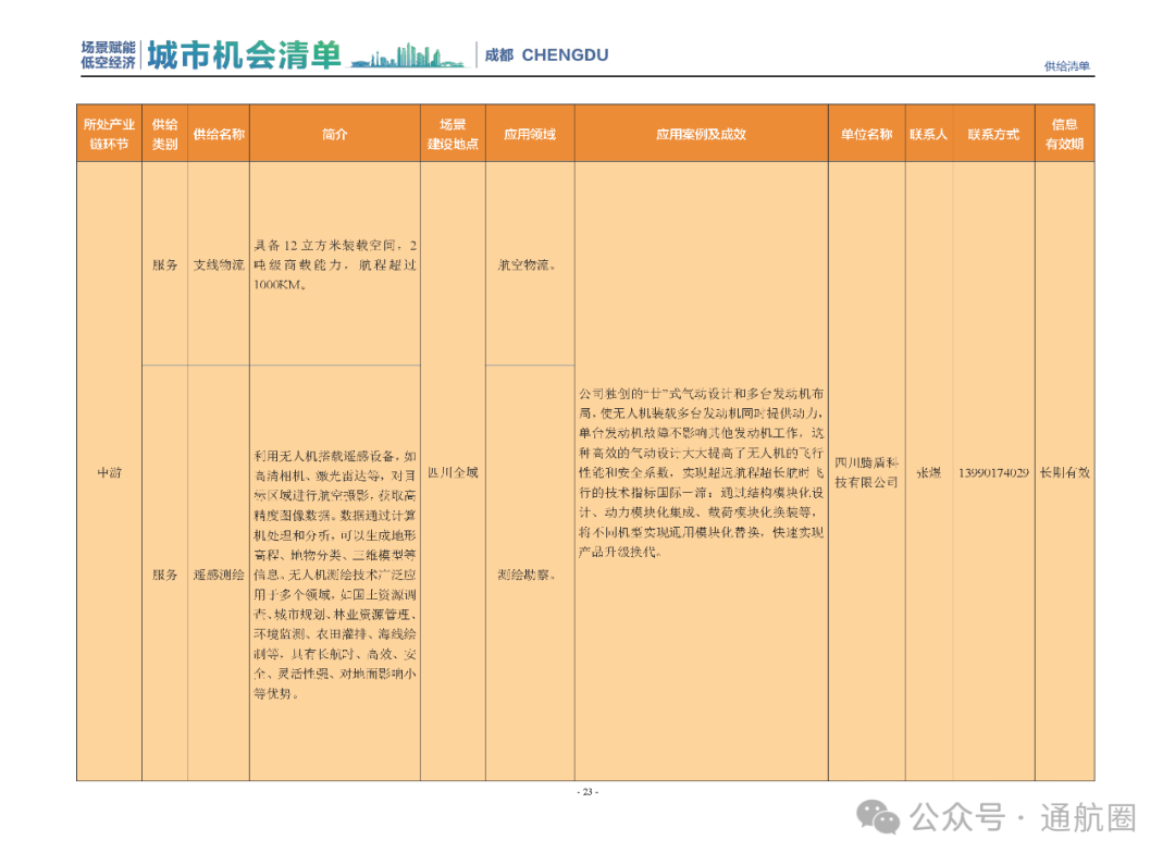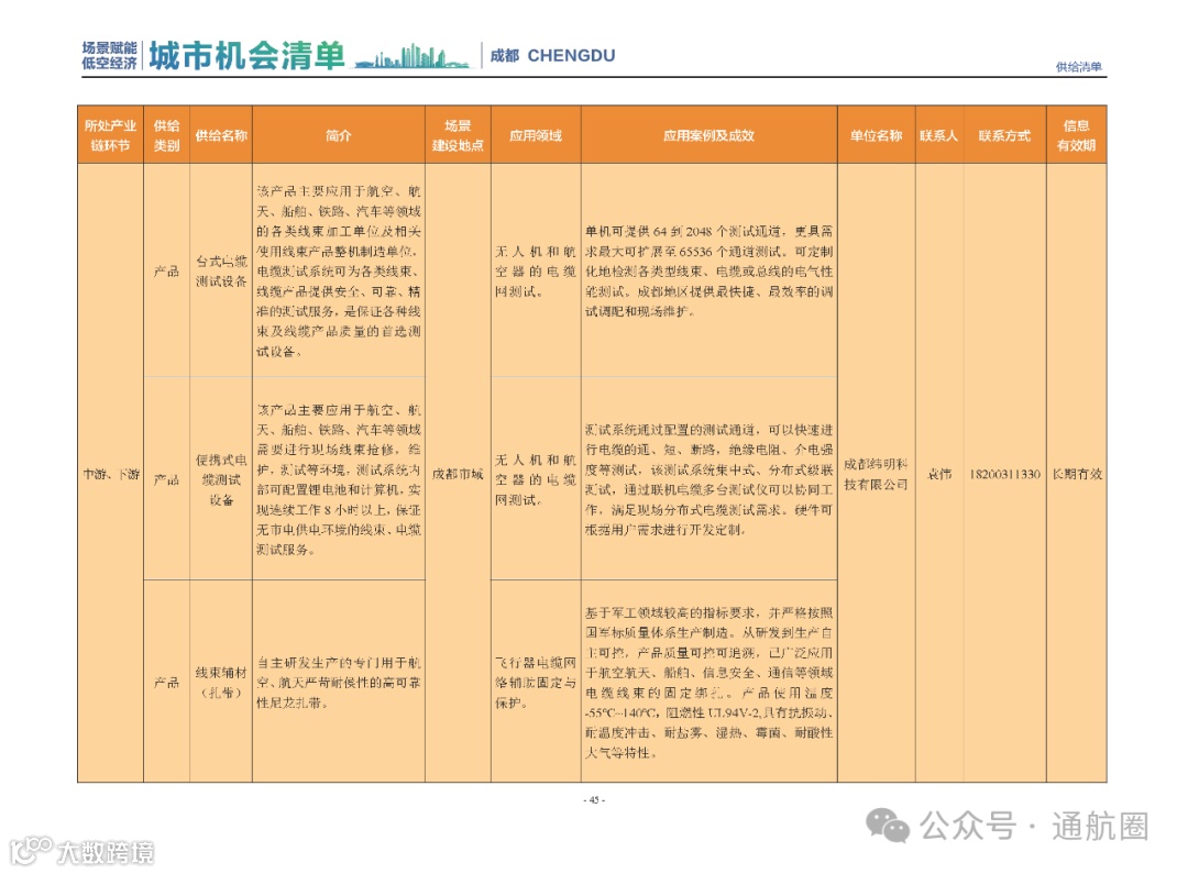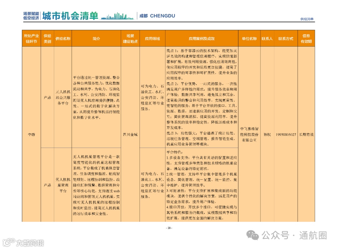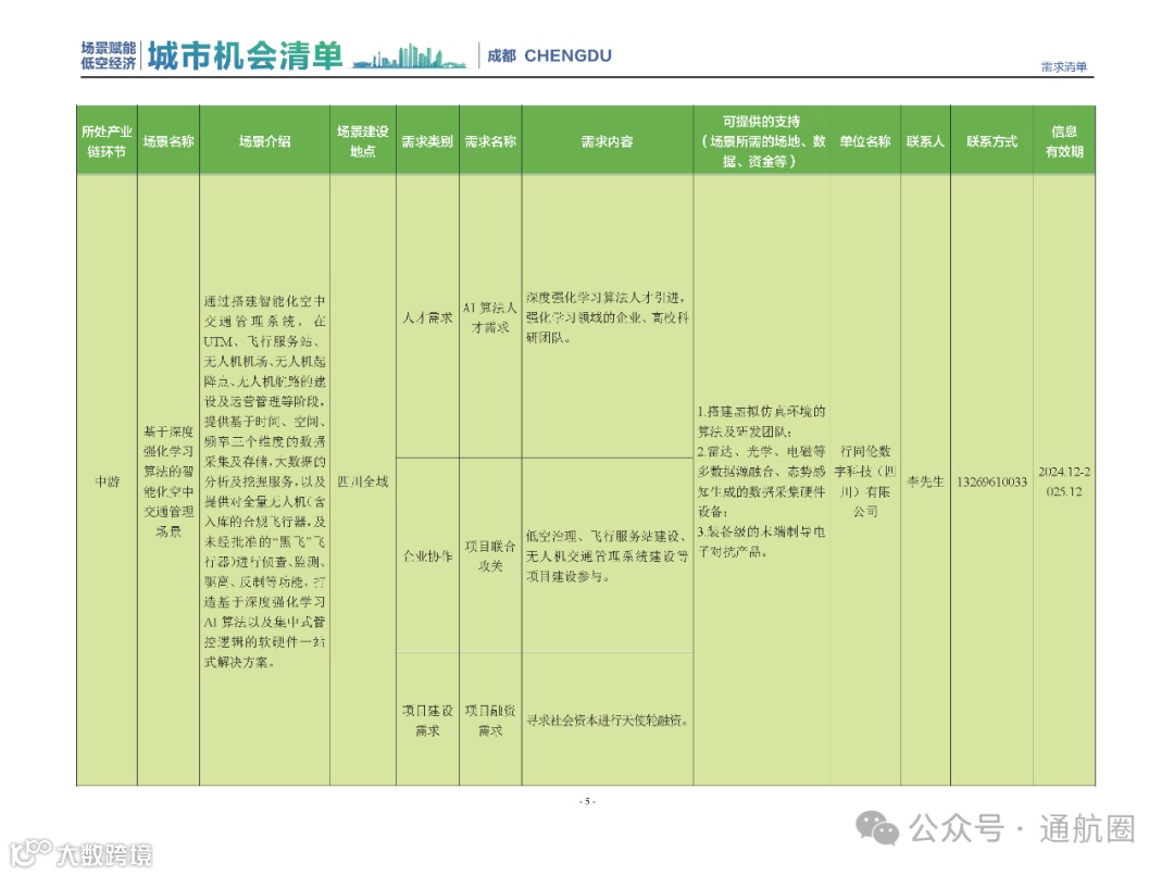 成都市经信局市新经济委总工程师代兰表示,拓展低空市场应用场景、做强低空产业支撑,是加快探索低空产业新业态新模式、开辟发展新领域新赛道的重要途径。据介绍,本批次《场景赋能低空产业城市机会清单》围绕场景赋能低空产业增长新模式,聚焦低空领域新技术新产品首发、首秀、首试、首用,以及新场景建设,梳理发布供需信息共92条(需求信息18条、供给信息74条),涉及总投资242亿元,旨在促成项目、场景、技术、需求有效对接,推动成都低空产业机会共享、场景共建、协同发展,助力打造未来经济发展新引擎。从需求方面来看,清单涵盖产业链上下游各环节的诸多场景,涉及多种类别:例如金堂县淮州新城的低空经济总部经济区项目、四川省人工影响天气办公室的大型无人机人工影响天气作业场景、西航投(成都)科技集团有限公司的无人机智慧牧场场景、四川航天中天动力装备有限责任公司的小型涡喷涡扇发动机研发生产场景,提出了产业协作配套、项目建设、技术攻关、人才引进等具体需求。