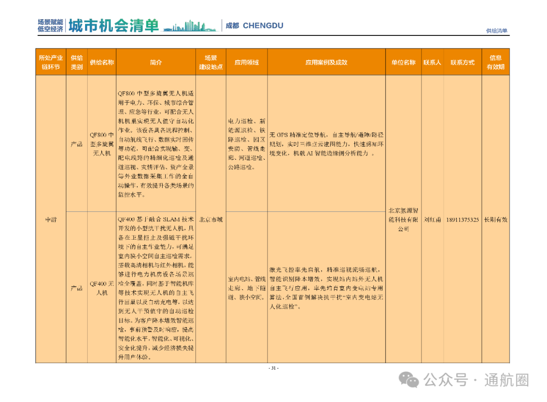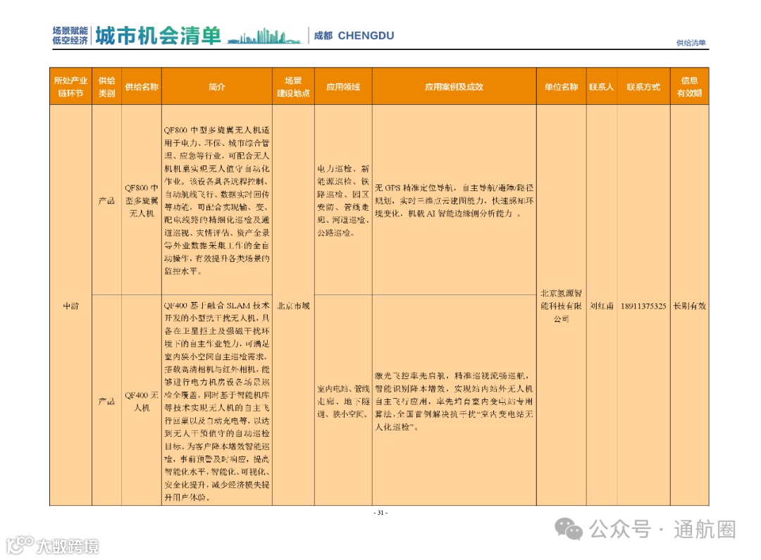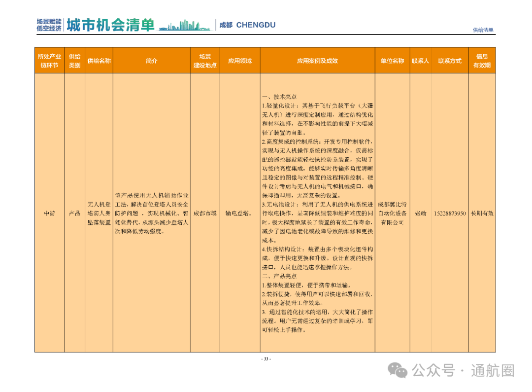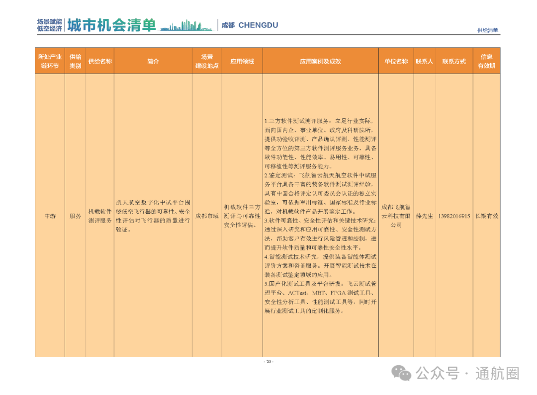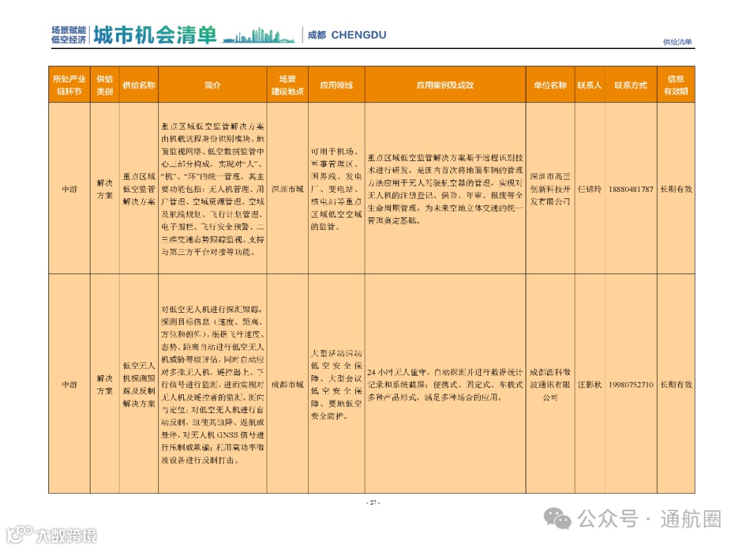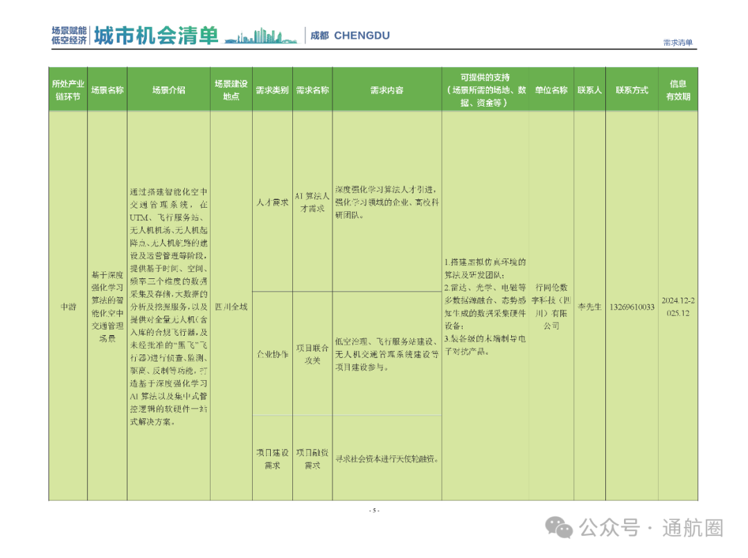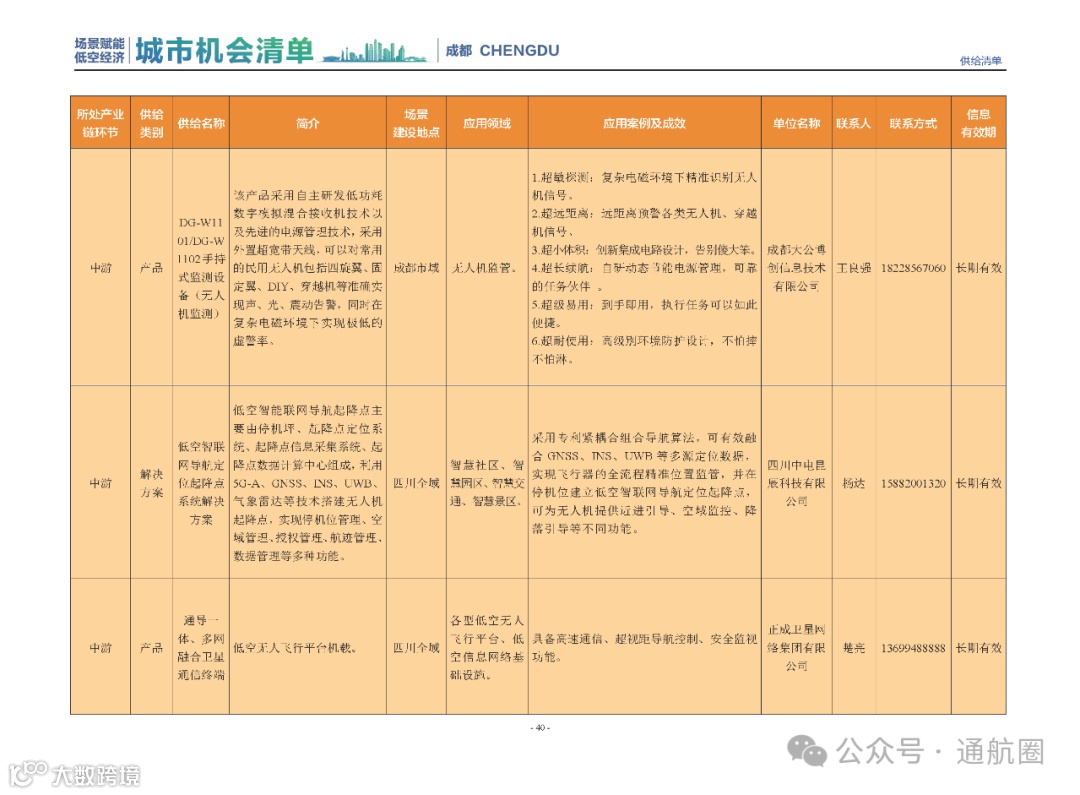 成都市经信局市新经济委总工程师代兰表示,拓展低空市场应用场景、做强低空产业支撑,是加快探索低空产业新业态新模式、开辟发展新领域新赛道的重要途径。据介绍,本批次《场景赋能低空产业城市机会清单》围绕场景赋能低空产业增长新模式,聚焦低空领域新技术新产品首发、首秀、首试、首用,以及新场景建设,梳理发布供需信息共92条(需求信息18条、供给信息74条),涉及总投资242亿元,旨在促成项目、场景、技术、需求有效对接,推动成都低空产业机会共享、场景共建、协同发展,助力打造未来经济发展新引擎。从需求方面来看,清单涵盖产业链上下游各环节的诸多场景,涉及多种类别:例如金堂县淮州新城的低空经济总部经济区项目、四川省人工影响天气办公室的大型无人机人工影响天气作业场景、西航投(成都)科技集团有限公司的无人机智慧牧场场景、四川航天中天动力装备有限责任公司的小型涡喷涡扇发动机研发生产场景,提出了产业协作配套、项目建设、技术攻关、人才引进等具体需求。