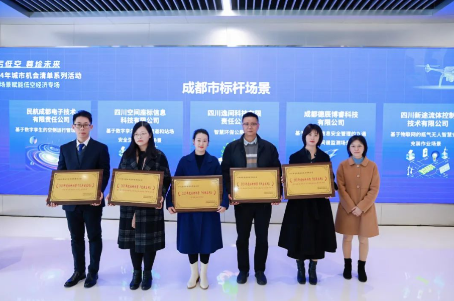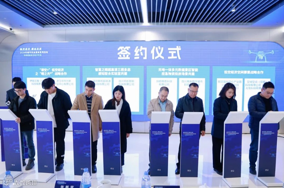 当天会上还为“2023年度标杆场景”中涉及低空产业、绿色氢能等领域的四川腾盾科技有限公司的大型高空无人机全网应急通信场景、四川知周科技有限责任公司的基于数字孪生的飞机分队战术模拟仿真训练场景等14个项目予以授牌。包括“滞空+”低空经济之“曙之光®”战略合作、智慧之眼超高清三栖多态感知联合实验室共建、天地一体多元数据景区智能应急物资投放场景共建、低空经济空间要素战略合作等四大项目举行了签约仪式。