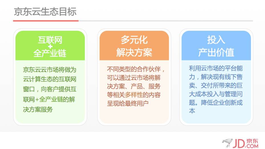 京东云生态体系是一个全产业链的生态。希望通过这样的平台能力,使创业者、云应用能够以更低的成本去进入市场。在一些产品和一些解决方案上能够更快的落地,更快的找到合适的用户,进而帮助更多传统企业,实现互联网+的全面转型。