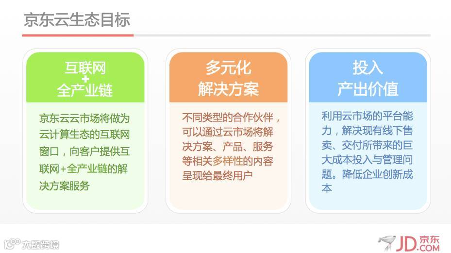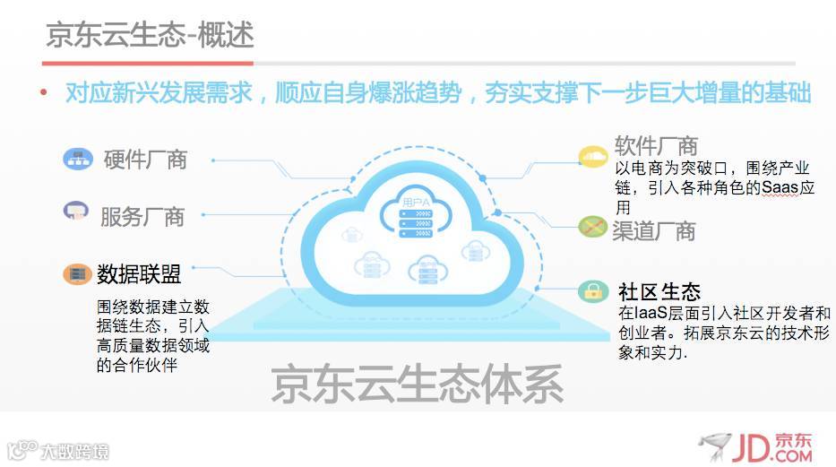 京东的开放模式让京东云生态发展迅速扩大,开放生态的目的是为了给用户以及行业带来更大的价值。生态是京东云的必由之路,京东将建造一个全产业链的、能够满足纷繁复杂的客户需求的云平台,并联合硬件厂商、软件厂商、服务厂商、渠道厂商、数据联盟共同构建社区生态。